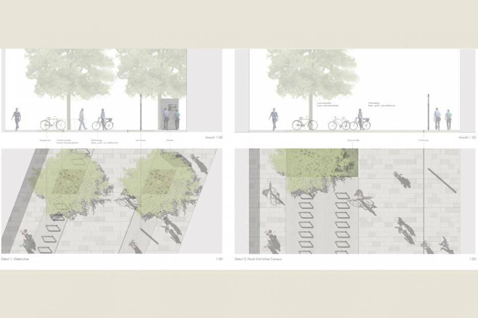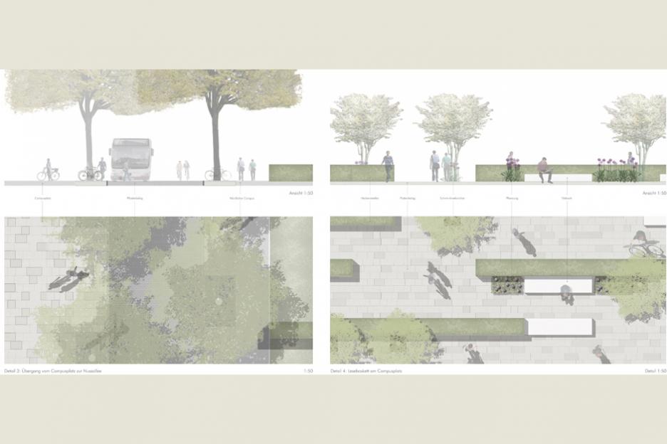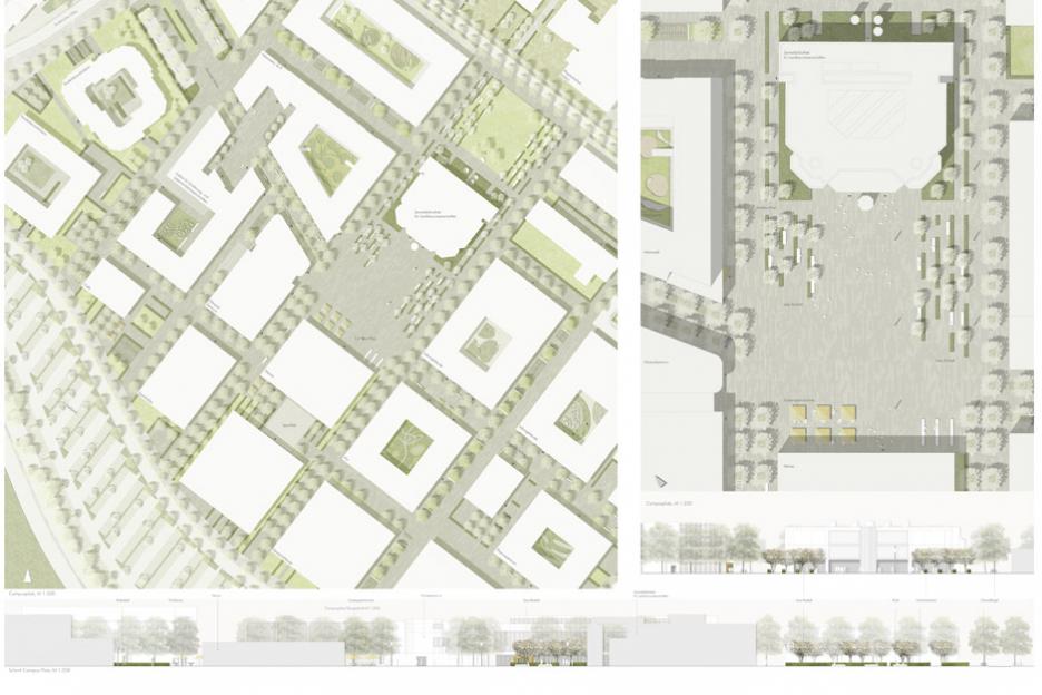 Für das zukünftige Lehren und Lernen ist der Freiraum bedeutend als Begegnungs- und Austauschzone zwischen den Studierenden, den verschiedenen Disziplinen und Instituten. Das Gewebe aus städtischen und grünen Räumen wird als vielschichtiger Katalysator für Kontakte und Wissenstransfer verstanden.