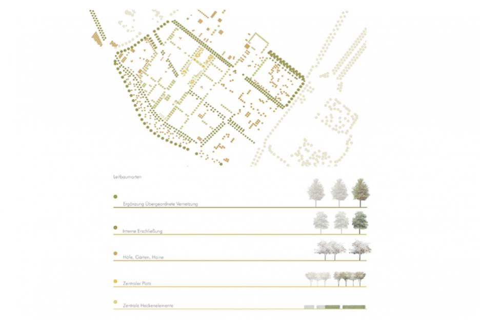 Anknüpfend an die rheinische Gartentradition wird ein neues Gartengewebe gesponnen welches dem heterogenen Stadtkörper Identität und Zusammenhalt gibt. Er ist ein vielschichtiger Komplementärraum, in welchem Zonen der Dichte mit Orten der Konzentration und Stille verwoben werden. Er entwickelt ein eigenständiges Profil als „Campus in den Gärten“. Somit wird die gärtnerische Tradition des Ortes mit der Entwicklung des Stadtteils nicht ausgelöscht sondern reaktiviert und in die Zukunft transportiert.