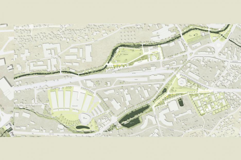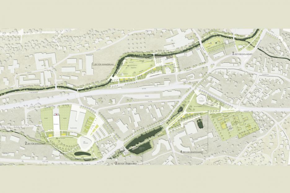 Im fragmentierten „Westend“ der Stadt Schmalkalden werden fünf Freiräume zu einem stützenden Parkgewebe verbunden.
