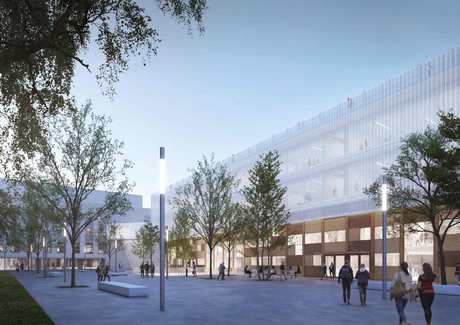 Mit dem neuen Lerngebäude wird ein wichtiger Baustein im Freiraumsystem des Campus gesetzt. Die vorgeschlagene Gestaltung setzt auf eine grünere Ausprägung des Campus, indem wo immer möglich Flächen entsiegelt und durch artenreiche aber robuste Pflanzsäume ersetzt werden. Dabei entsteht dennoch ein differenziertes aber klares Raumgefüge, in dem Orientierung und Aneignung intuitiv erfolgen. Durch die Freistellung des Gebäudes zum Kreuzungsbereich Gleueler Straße und Joseph-Stelzmann-Straße erfährt der Besuchereingang eine Hinwendung zur Stadt. Vom Baumbestand bleiben gute Solitäre als neue Platzbäume erhalten.