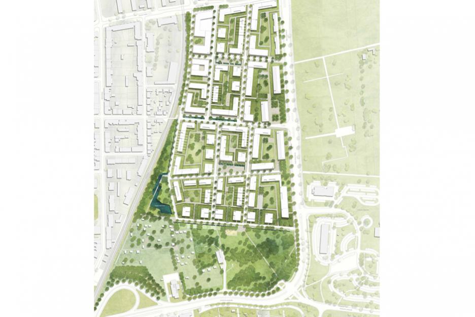 Das ca. 12 ha große Areal der ehemaligen Mackensenkaserne wird zu einem gemischten Stadtquartier transformiert, welches Bezüge der gewachsenen Stadt bewusst aufnimmt und eigenständig in einer neuen Haltung zu seinen inneren und äußeren Landschaftsräumen interpretiert. Die vielfältigen Angebote differenzierter Freiraumqualitäten, Raumerlebnisse, Wohn-Typologien und Nutzungen generieren einen lebendigen Stadtteil mit eigener Identität sowie hoher Lebensqualität für unterschiedlichste Bewohner, Beschäftigte und Besucher. Ein Vorschlag zur grünen Urbanität eines vitalen Quartiers am Stadtrand.