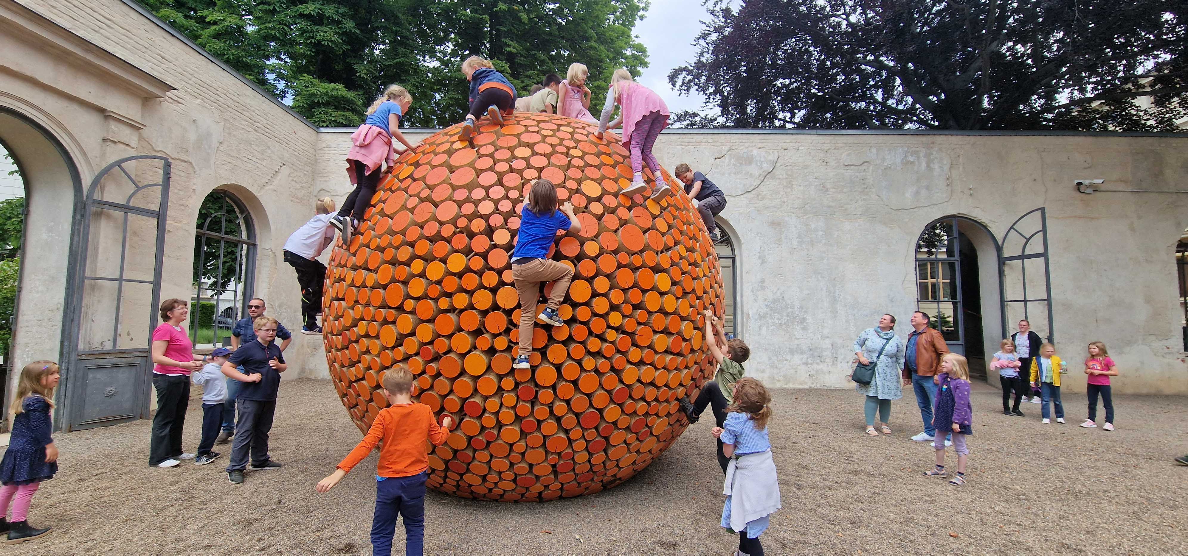 Mit der Landesgartenschau in Aschersleben bekam die Stadt im Jahr 2010 ein übermannshohes Kunstwerk/Spielgerät in Form einer Orange. Sinnfällig wurde sie an der sanierten Ruine der ehemaligen Orangerie im Bestehornpark aufgestellt. Damals erfunden und erbaut vom Künstler Gisbert Baarmann, begeisterte das einzigartige, bekletterbare Bauwerk zahlreiche große und kleine Besucher. 2019 fiel der orangefarbene Kugelkörper Brandstiftern zum Opfer. Doch der Wunsch nach der Rückkehr war so groß, dass u.a. dank Spendengeldern aus der Bürgerschaft und Eigenmitteln der Stadt Aschersleben die 8t schwere und 4,50m breite Orange aus Douglasienholz neu aufgebaut werden konnte. Im Auftrag des Künstlers Gisbert Baarmann übernahm dies der Tischler Majo Ertel in seiner Werkstatt in Brandenburg. Mit einem Schwerlasttransporter konnte die Orange 2.0 am 21./22. Mai 2024 sicher nach Aschersleben überführt werden. Die offizielle Einweihung fand am 07. Juni 2024 statt.