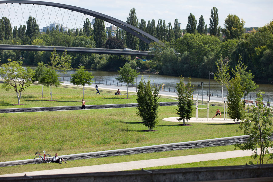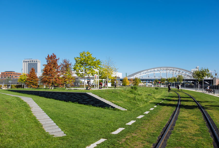 Der Hafenpark am östlichen Ende der Mainuferpromenade wurde zwischen 2013 und 2015 abschnittweise eröffnet. Er ist gleichzeitig intensiv genutzter Stadtpark und die ökologische Ausgleichsfläche für die benachbarte EZB, die neben zwei Eisenbahnbrücken die Blickbezüge bestimmt. Extensive Wiesen mit eingestreuten Sport- und Spielelementen zwischen Klimabäumen prägen die erhöhten Schollen im „Wiesenband“, das an die Mainuferpromenade angrenzt.