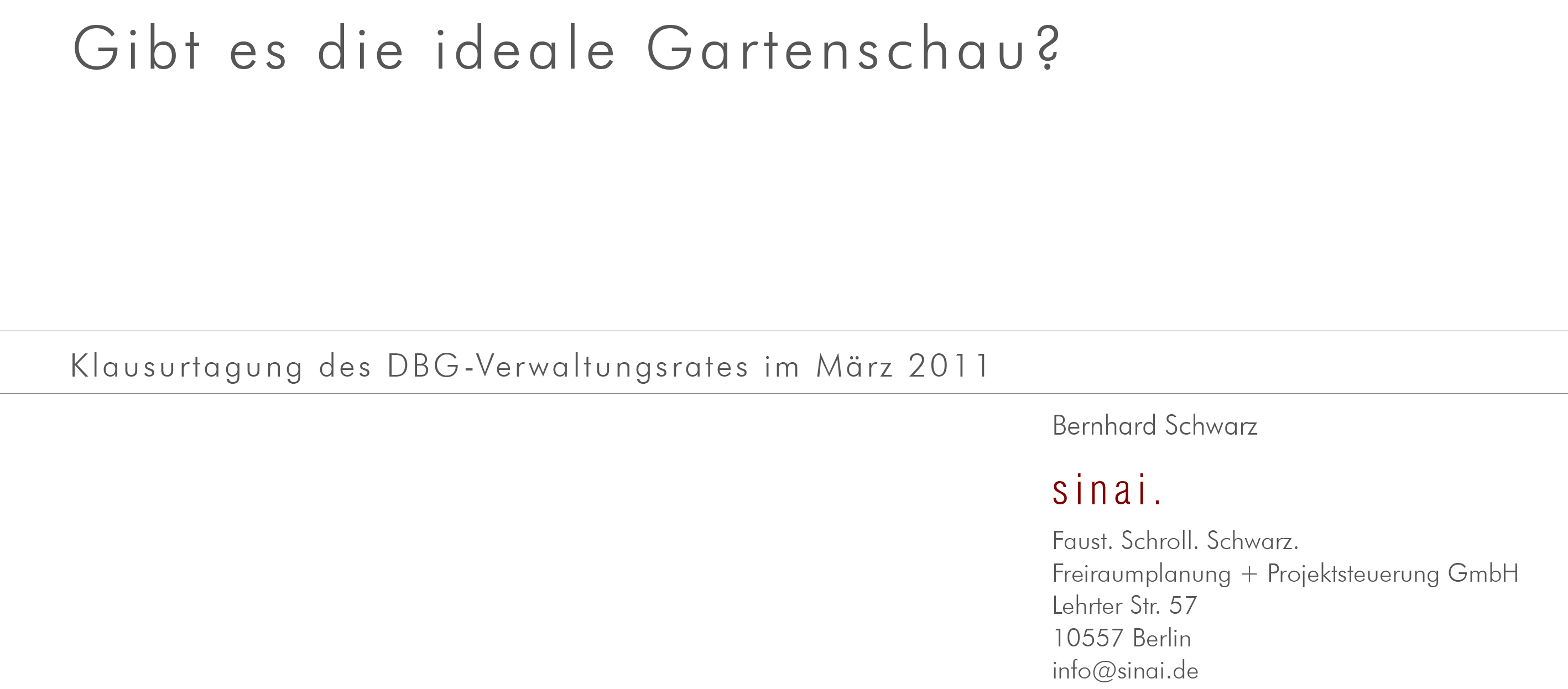 Anhand von konkreten Sinai-Projekten wird aufgezeigt, dass erfolgreiche Gartenschauen planbar sind. Entscheidend dabei sind die richtigen Erfolgszutaten: Definition der Ziel- und Erfolgskriterien, Planung, Organisation, Budget, Termine sowie Realisierung.