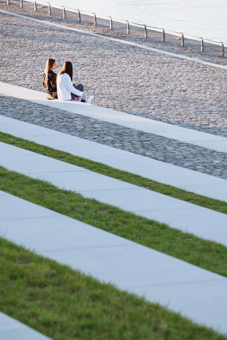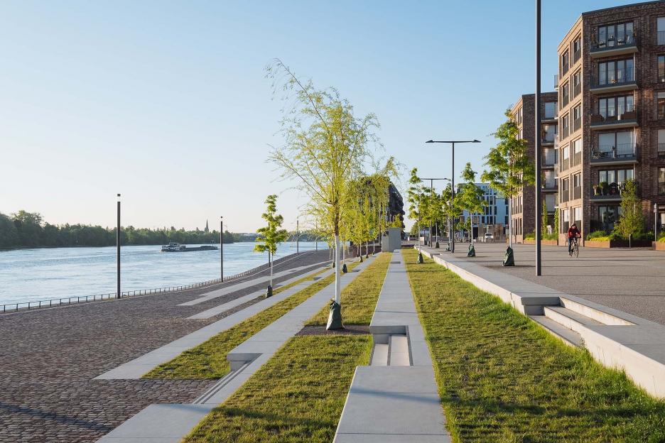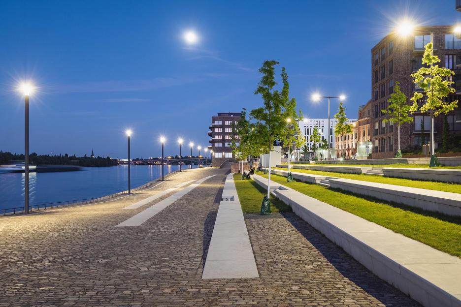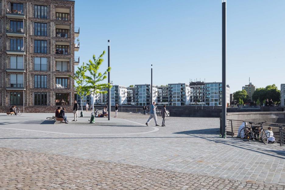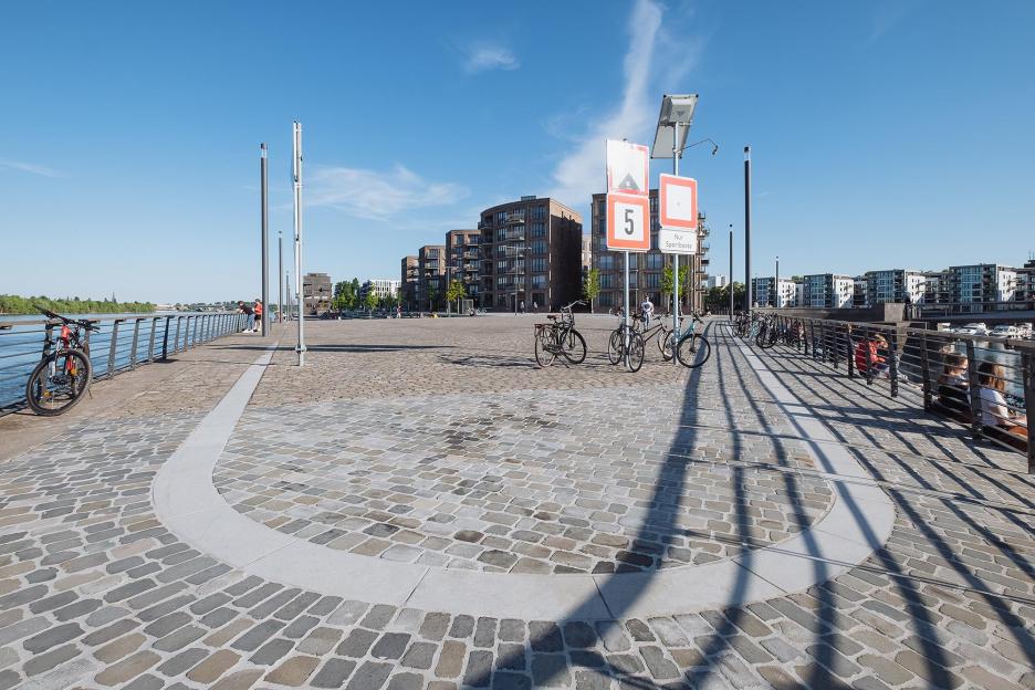 Die Grundstruktur des Zollhafens folgt einer sofort verständlichen Zonierung. Entlang der historischen Fluss- und Hafenkais wird eine raue, von Altpflastern geprägte Schale ausgebildet, in die moderne Inlays der neuen Stadtquartiere eingebettet sind. Diese Spannung aus historischer Rustikalität und vornehm-komfortabler Einfachheit an der Grenzlinie zwischen Quartier und Ufer prägt durchgängig die Freiraumfolge des vorhandenen Rundweges, des „Loops“. Ausgehend von dieser einfachen materiellen Setzung entsteht durch die Proportionierung der Flächen, die Baumsetzungen und den Anteil des Grüns eine vielfältige typologische Differenzierung.