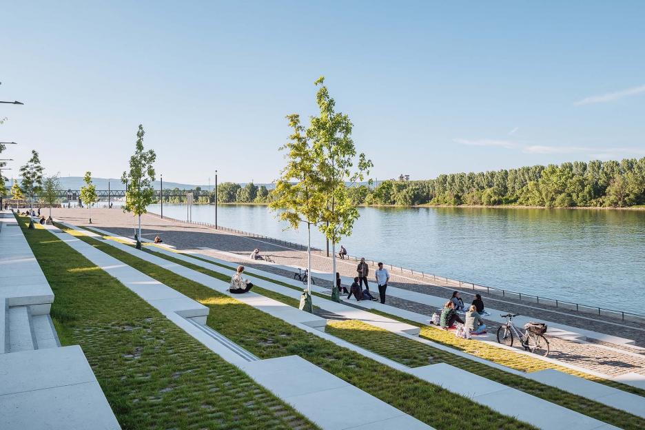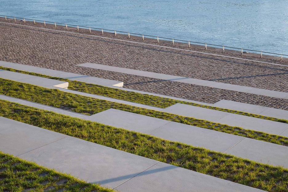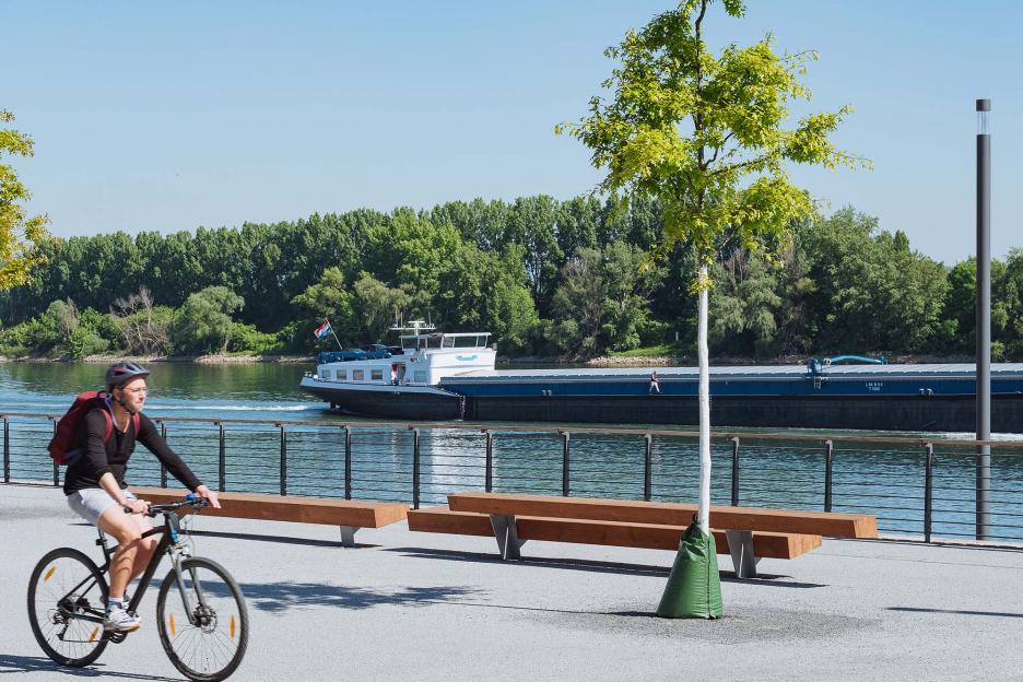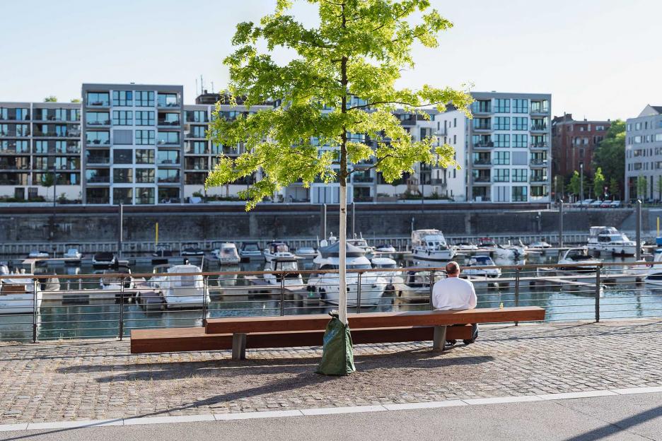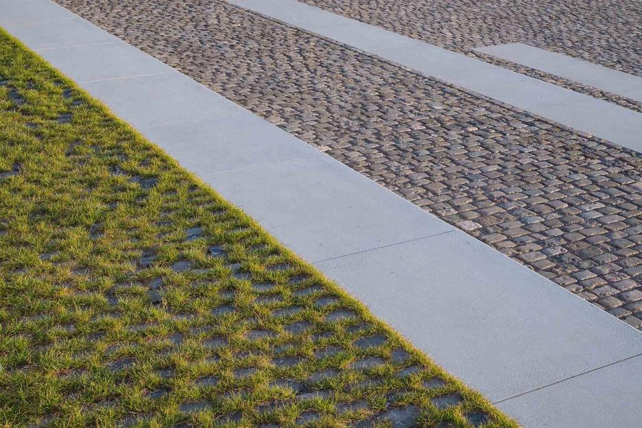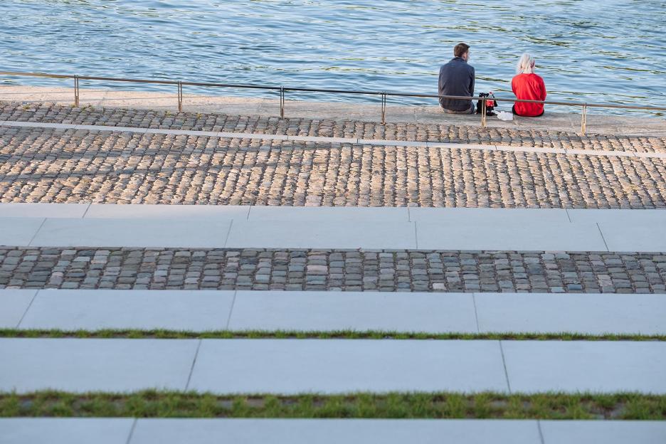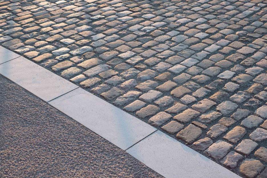 Die Grundstruktur des Zollhafens folgt einer sofort verständlichen Zonierung. Entlang der historischen Fluss- und Hafenkais wird eine raue, von Altpflastern geprägte Schale ausgebildet, in die moderne Inlays der neuen Stadtquartiere eingebettet sind. Diese Spannung aus historischer Rustikalität und vornehm-komfortabler Einfachheit an der Grenzlinie zwischen Quartier und Ufer prägt durchgängig die Freiraumfolge des vorhandenen Rundweges, des „Loops“. Ausgehend von dieser einfachen materiellen Setzung entsteht durch die Proportionierung der Flächen, die Baumsetzungen und den Anteil des Grüns eine vielfältige typologische Differenzierung.