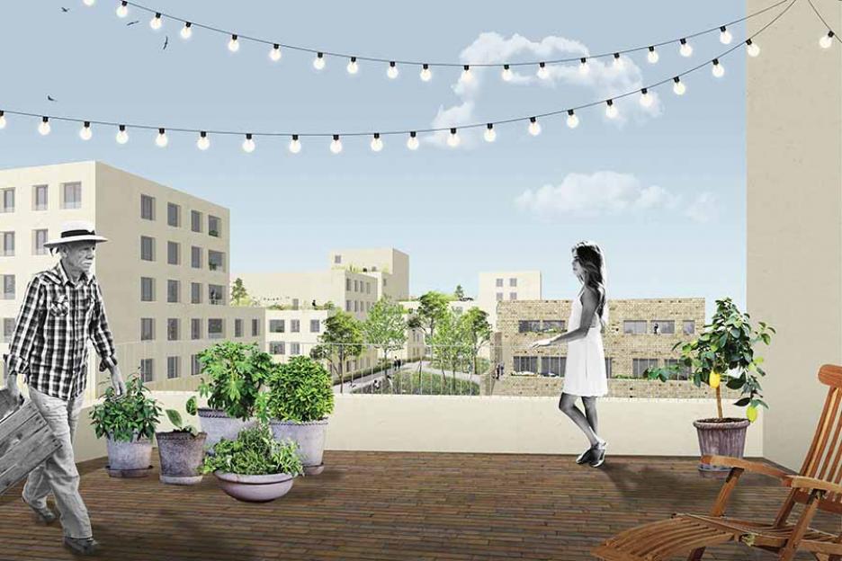 Der Gemeinschaftsgedanke findet sich auch auf den Dachterrassen wieder: Hier entstehen robuste Gartenlounges mit erhöhten Beeten. Dadurch werden zusätzliche grüne Räume für die Hausgemeinschaften geschaffen.