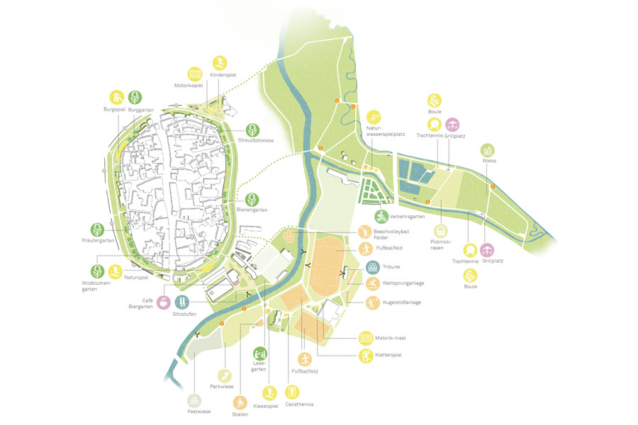 Ausgangspunkt für eine „Fahrt ins Blaue“ aber ist das grüne Oval des Stadtwalls als sammelndes Motiv der inneren Stadt. Die behutsame Sanierungsstrategie der Stadt wird hier fortgesetzt; der Wallring wird mit freiräumlichen und städtebaulichen Raumfolgen an das Ufer herangebracht.