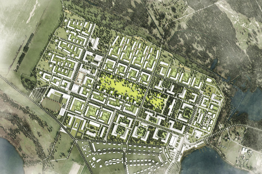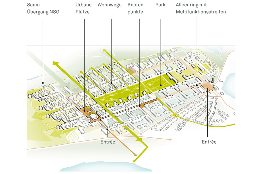 Kompakte Bebauung, attraktive Nutzungsmischungen und ein doppelter Freiraumring prägen die urbane Kernzone. Die typologisch gemischten Quartiere am Rand leiten mit individuellen Atmosphären zu den Landschaftsräumen über. Ein attraktives Freiraumnetz für Fußgänger und Radfahrer durchzieht das Areal, getragen von der Idee der Durchdringung von Stadt und Landschaft.