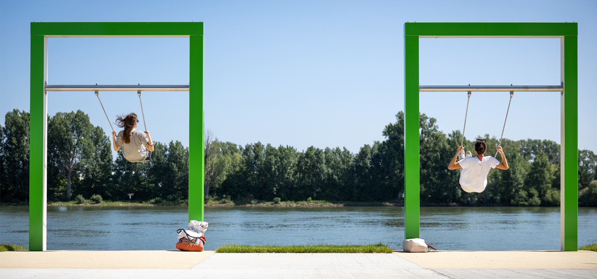 Der Uferpark „Nordmole Zollhafen Mainz“ erinnert an das industrielle Erbe des Zollhafens. Eine großzügige Platzfläche mit einem inszenierten Hafenkran der Fa. Minthe bildet das Herzstück der Anlage. Drei 4,50m hohe „Rheinschaukeln“ laden an dieser Stelle zum freien Schwingen mit Blick auf den Rhein ein. Entlang der Uferpromenade entstehen Outdoor-Fitnessbereiche mit Calisthenics-Geräten, eingebettet als EPDM-Fläche in die Parkwiese bilden sie einzelne „Sportsbays“. Am südlichen Ende mündet der Park in den „Peak“ – ein Aussichtspunkt mit Rundbank, Großsteinpflaster und Panoramablick. Ein mehrstämmiger Solitärbaum betont den Ort und spendet Schatten. Der zweite Bauabschnitt ist derzeit im Bau und soll bis Frühjahr 2026 abgeschlossen sein.