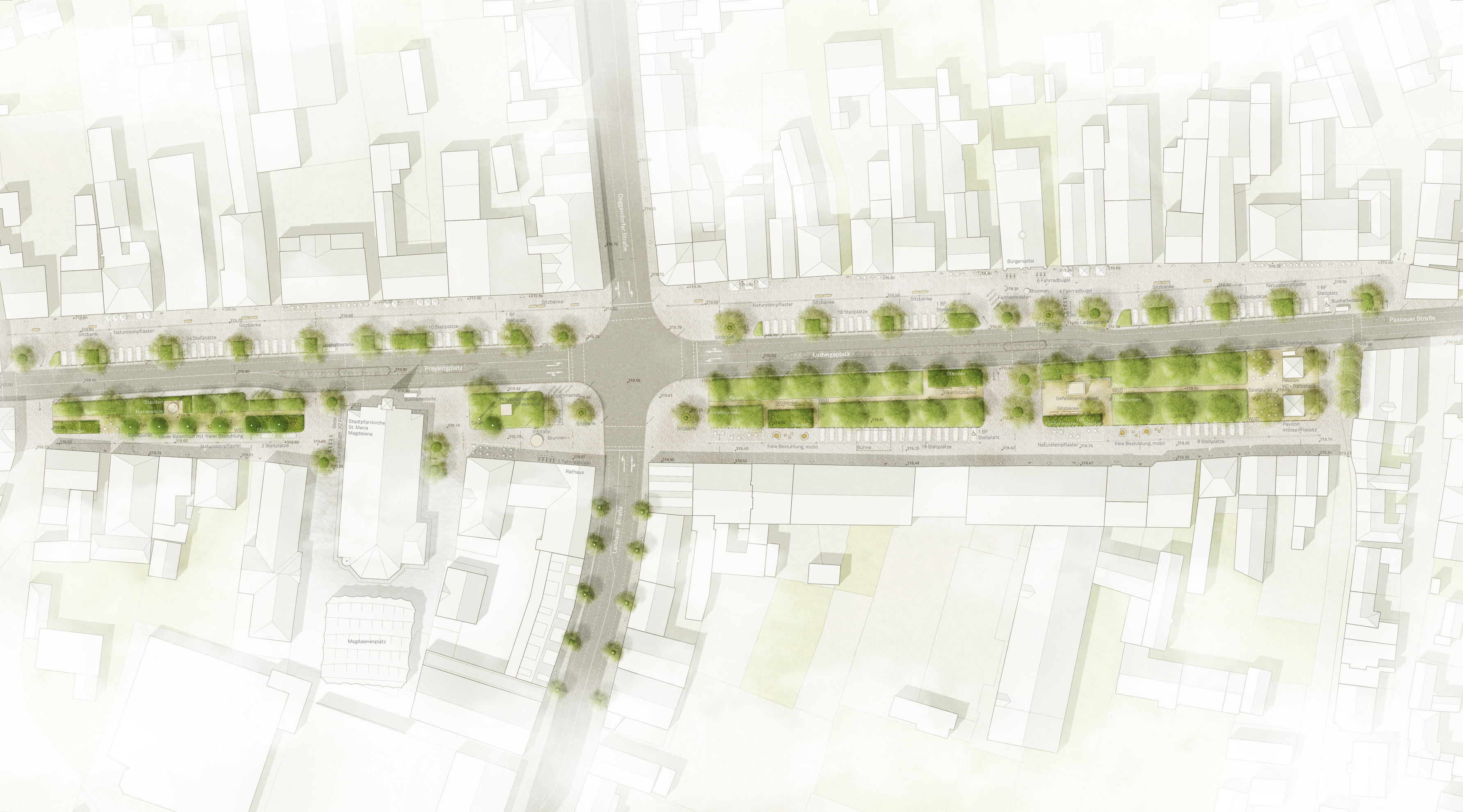 Drei neue Grüninseln verbinden den Platz zu einem zusammenhängenden Stadtraum, während das historische Granitpflaster aufgearbeitet und barrierefrei hergestellt wird. Verkehr und Aufenthalt werden neu ausbalanciert – mit verkehrsberuhigten Zonen, integrierten Stellplätzen und flexiblen Flächen für Märkte, Gastronomie und Feste. So entsteht ein lebendiger Stadtplatz, der Tradition bewahrt und zugleich auf die Herausforderungen der Zukunft antwortet.