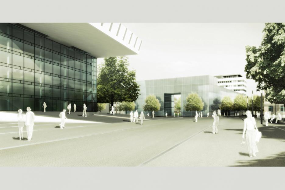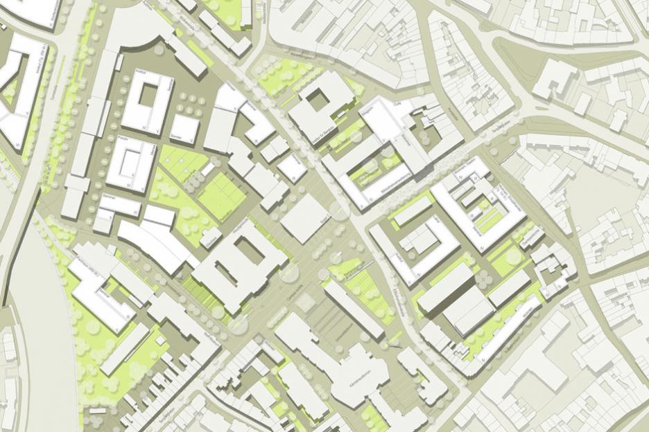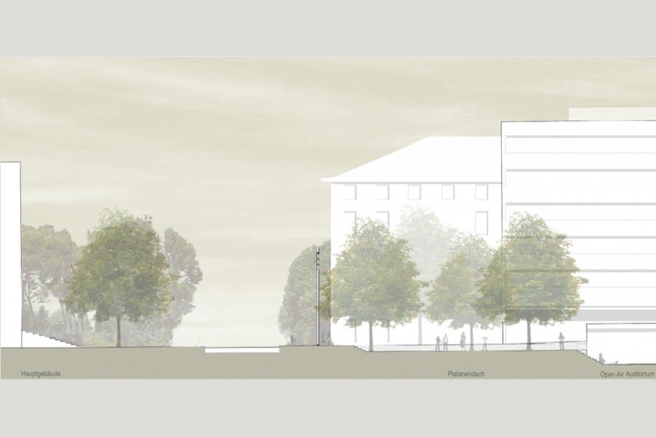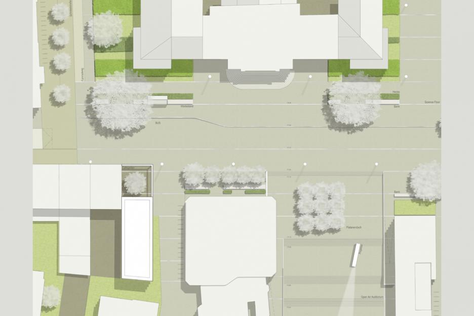 Die Freistellung der Einzelarchitekturen am Universitätsforum bildet eine bewusste Abkehr und stadtbildprägende Ausnahme vom traditionellen Stadtraum des Grabenrings. Diese räumliche Alleinstellung macht den Sonderstatus der Exzellenz-Hochschule sinnlich erfahrbar. Es entsteht tatsächlich ein Center of Exellence.
