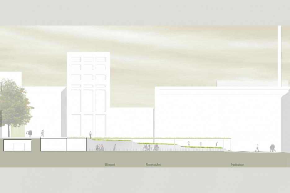 Campus nobilis - Ein überlagerndes Ordnungsprinzip formuliert den zentralen Campus. Die lineare Rasterung zeigt sich in der Reliefausbildung mit Treppen und Rasenterrassen und vor allem im markant linierten Stadtboden.