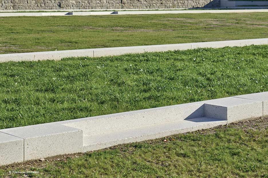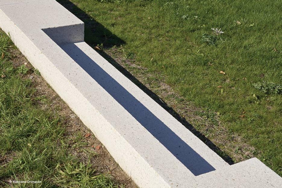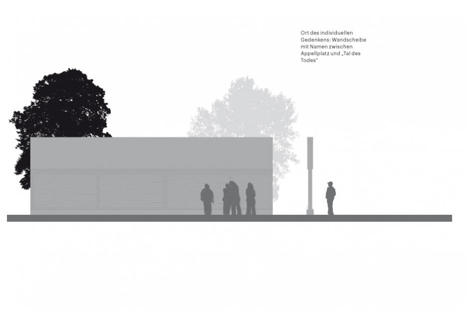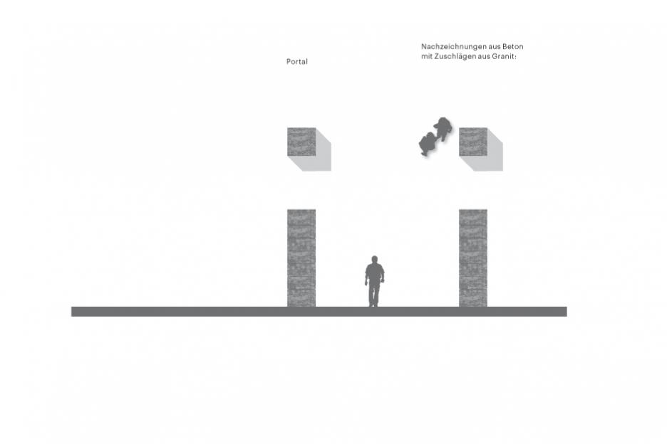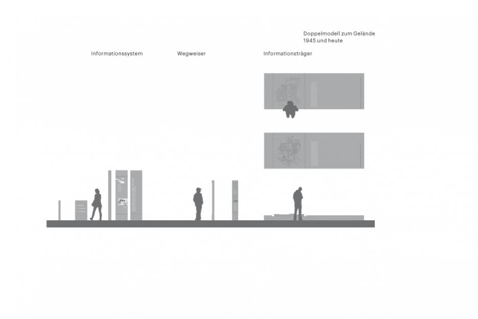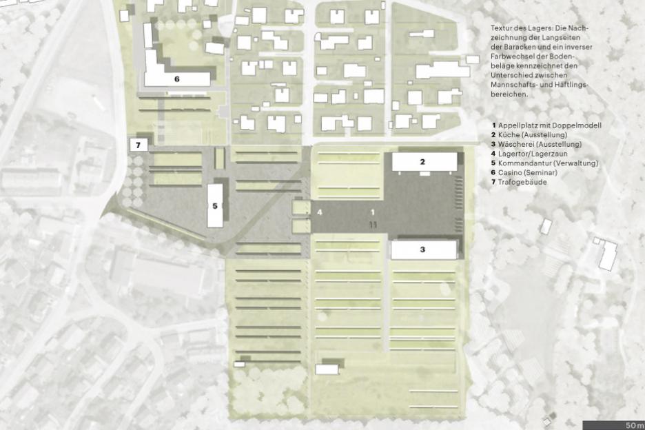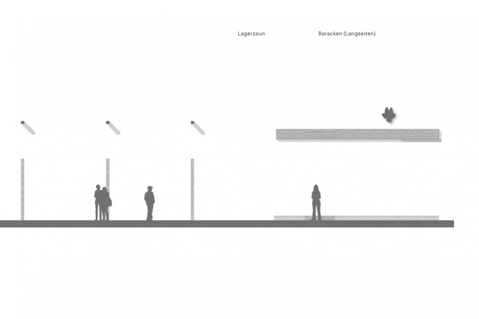 Mit einem System von Nachzeichnungen wird der historische Ort anhand seiner verlorenen Strukturen sichtbar gemacht. Barackenfelder und Lagergrenzen werden mit Betonelementen abstrakt verdeutlicht. Die Nachträglichkeit von Nachzeichnungen und Infosystemen wird für den Besucher an jedem Ort sofort erkennbar sein, die Überformung des Geländes bleibt sichtbar.