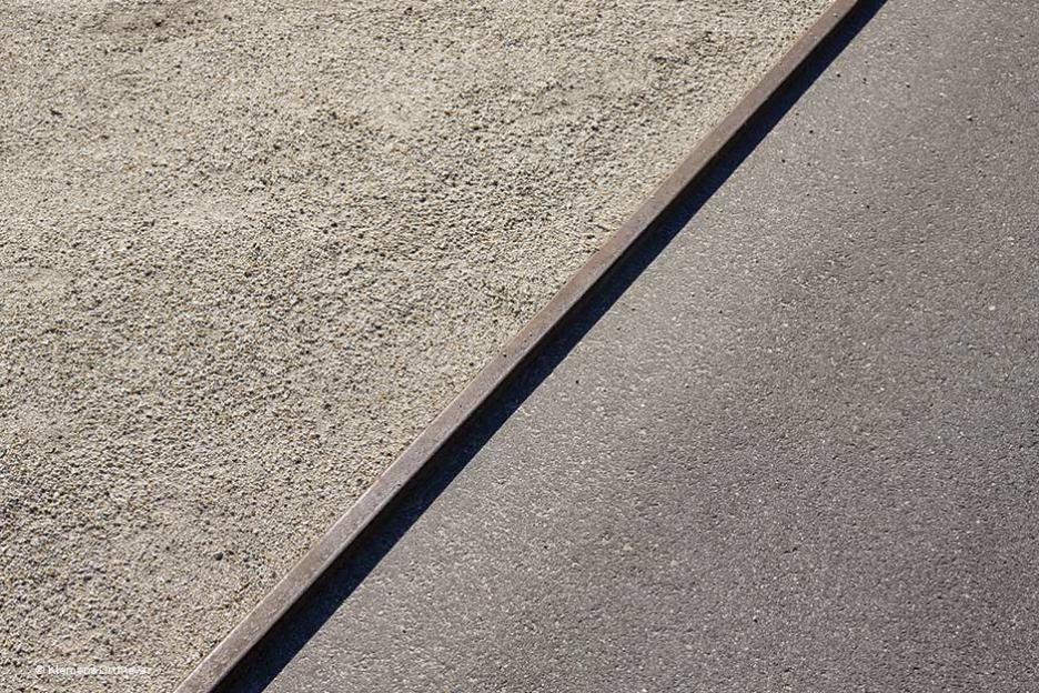 Primäres Element des Layouts ist ein gestrecktes Platzband zwischen dem öffentlichen Raum an der vormaligen Kommandantur und dem Appellplatz im Häftlingsbereich mit den Ausstellungsgebäuden Küche und Wäscherei. Dieses „Erkundungsfenster“ stellt den physischen und gedanklichen Zugang zum Gelände her. Die Schwelle zum Häftlingsbereich wird mit einem inversen Wechsel der Materialfarben deutlich gemacht.