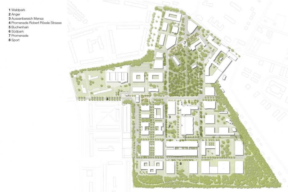Der Freiraum des Campus Berlin - Buch wird durch seine ausgeprägten, gewachsenen Grün- und Waldstrukturen als etwas Außergewöhnliches und Atypisches für einen Forschungs- und Wirtschaftsstandort wahrgenommen. Dieses Potential ist von besonderer Qualität für einen Gesundheitscampus. Mit dem landschaftsplanerischen Rahmenplan werden die Potentiale des Freiraums herausgearbeitet. Der Campus wird nicht als gleichförmige Parklandschaft verstanden, sondern als ein hierarchisches Freiraumsystem, das die Eigenheiten und Begabungen einzelner Orte schärft und dennoch den Campus als Gesamtes betrachtet. Zugleich erhöht sich die Identifikation mit dem Standort Buch und damit die Wahrnehmung von außen als hochwertiger und repräsentativer Campus-Standort.