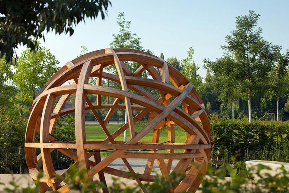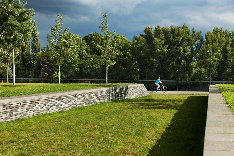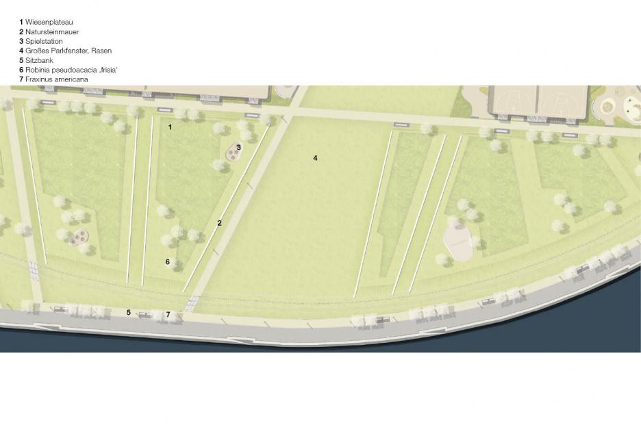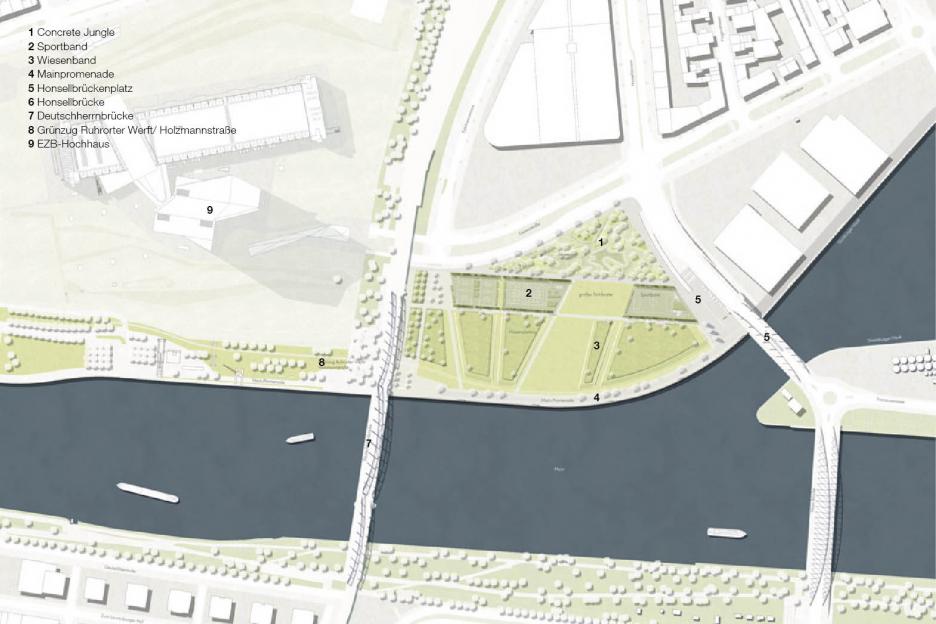 Die Grobstruktur des Parks ist großmaßstäblich gedacht: Die Blickbeziehungen zwischen Honsellbrücke und der Skyline der Innenstadt und der Bezug zum neuen EZB-Hochhaus prägen sich als prägnantes Sportband in den Entwurf ein. Mit dieser primären Setzung entsteht eine Abfolge kontrastierender Park-Sphären.