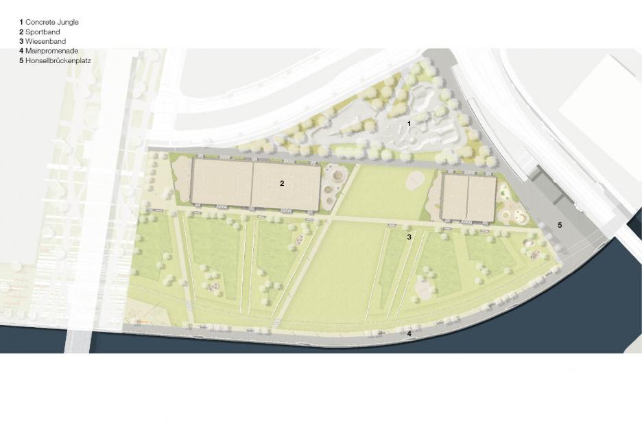 Der „concrete jungle“ an der Eyssenstraße ist mit 5.000 m² einer der größten Skateparks Europas. Er ist als offener Bestandteil des Parks gedacht. Die Bepflanzung mit Gräsern und Zürgelbäumen geben ihm ein grünes Gepräge. Im Sportband geben Stahltreillagen den Spielfeldern die Atmosphäre von Arenen, Spiel- und Fitnessbereiche sind vegetativ eingebettet. Zur Mainpromenade hin entstehen auf schollenartigen Wiesenplateaus Ruhezonen und natürliche Entwicklungsbereiche.