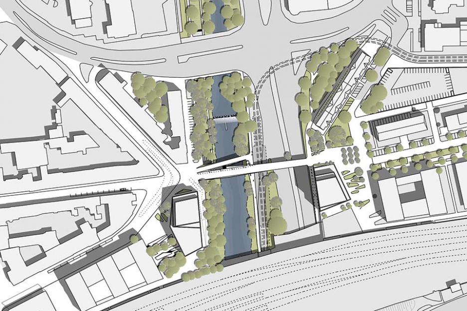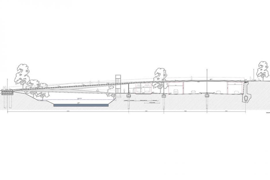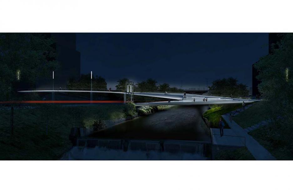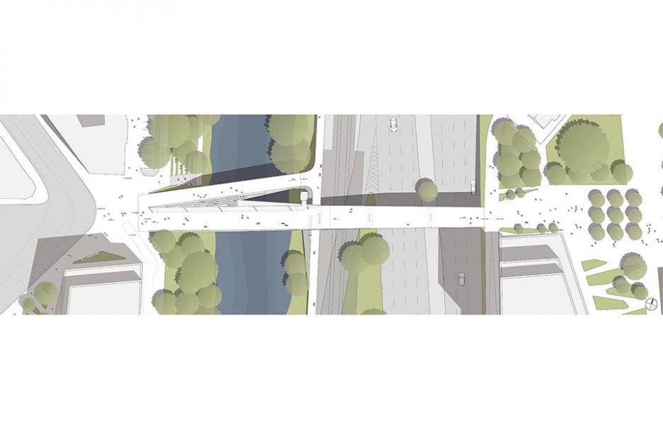 Die barrierefreie Kastenkonstruktion überspannt den historischen Flutgraben und die neue Stadtbahntrasse, deren Haltestelle unter dem Hauptdeck integriert ist. Dort bilden die eleganten Faltungen des Bauwerks auch eine attraktive Untersicht.