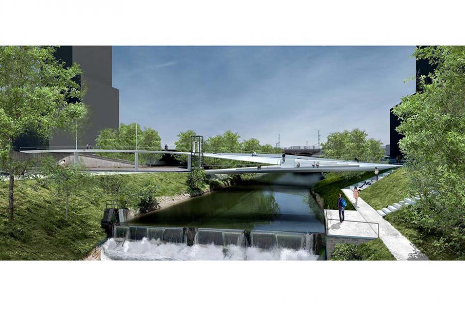 Die Brücke wird als urbanes Möbel verstanden. Logisch integrierte Sitztreppen bieten Aufenthaltsqualität mit Sitzgelegenheiten und Aussichten auf die Stadt. Der Raum wird zur Promenade.