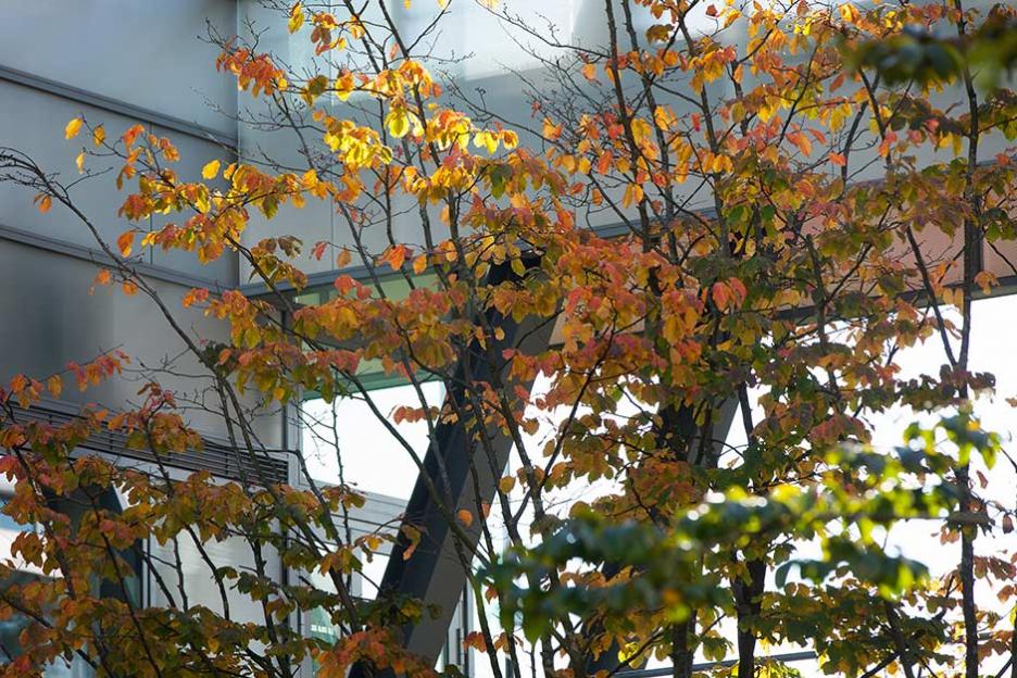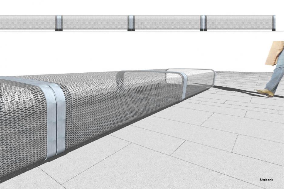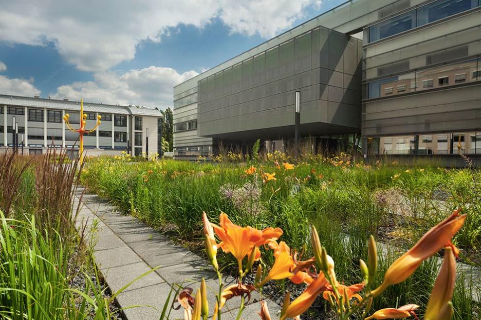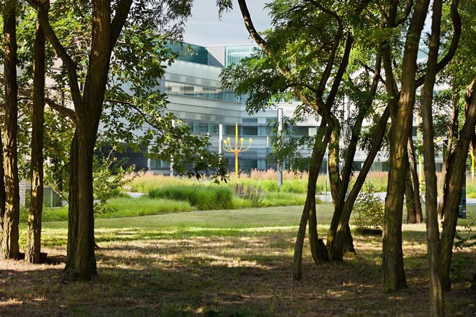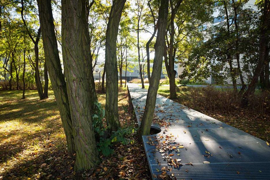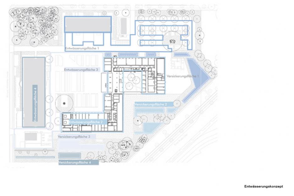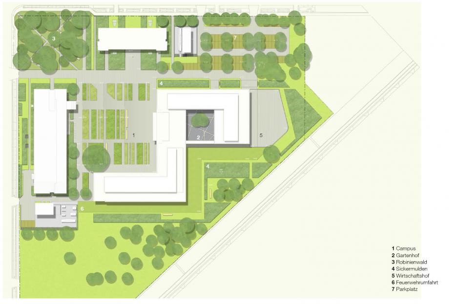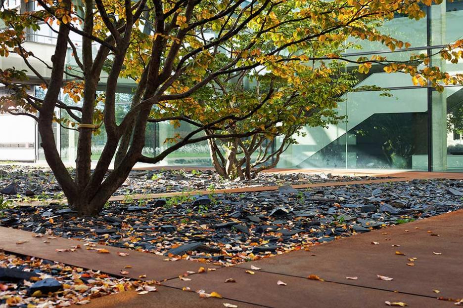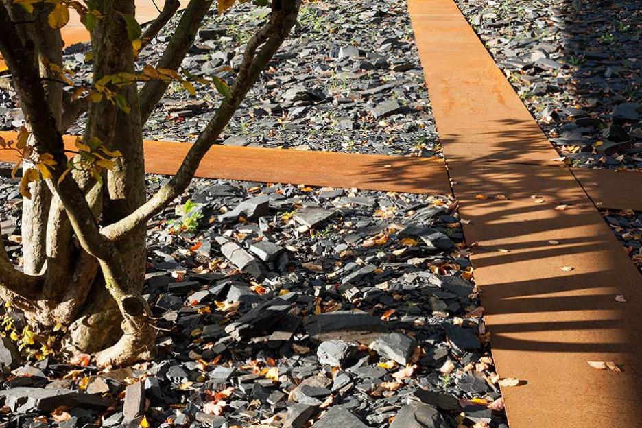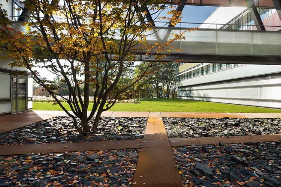 Der Gartenhof im Neubau ist spröde - Metallflächen, Schieferfelder und Eisenholzbäume thematisieren das kulturelle Urelement Eisen. Den Robinienwald in signifikanter Ecklage, durchquert ein leichter Gittersteg. Ein Saum aus eingesenkten Grasfeldern mit baumbestandenen Inseln dient der Versickerung des Regenwassers.