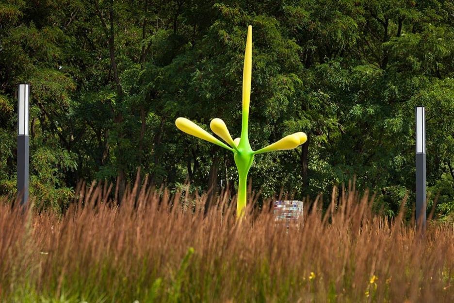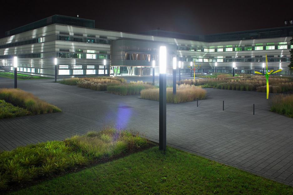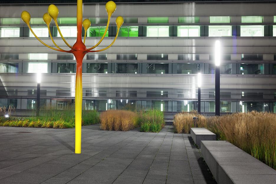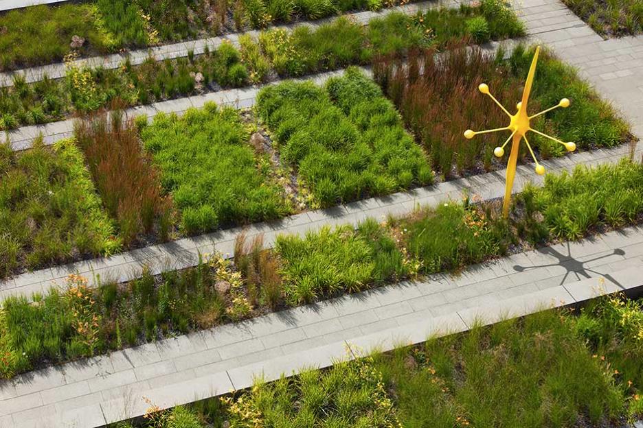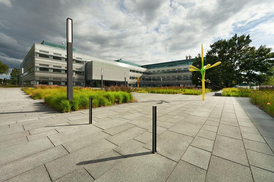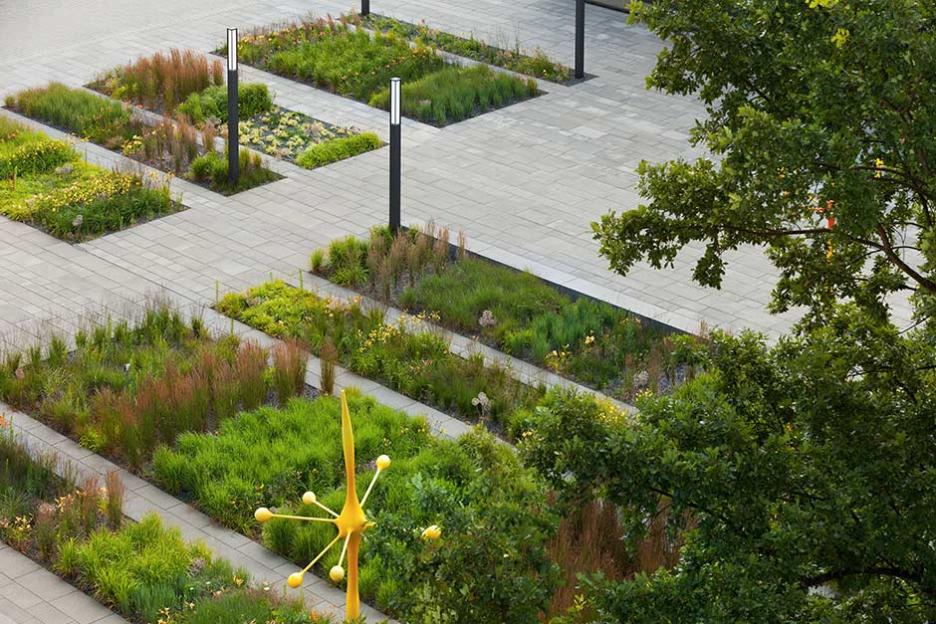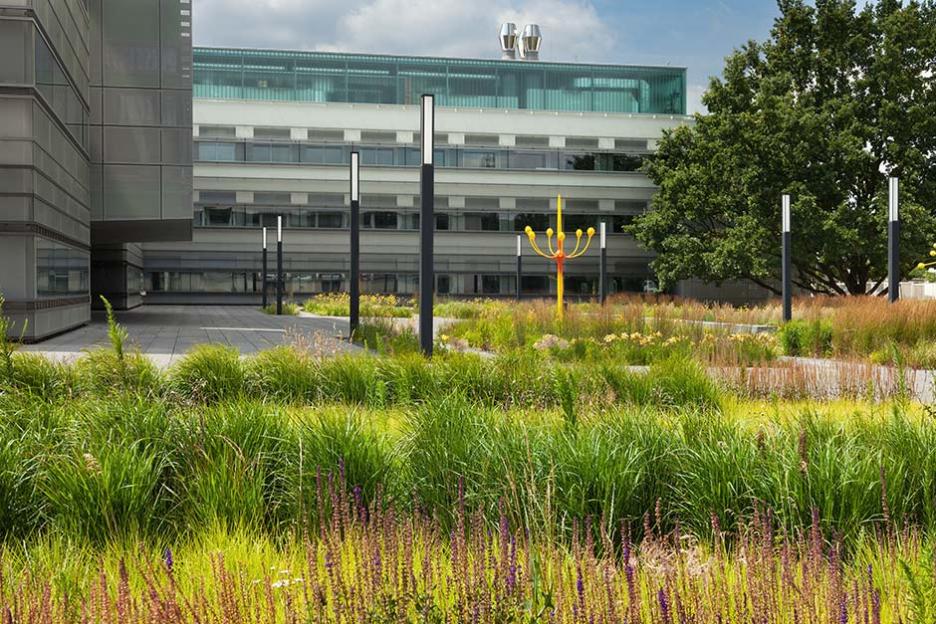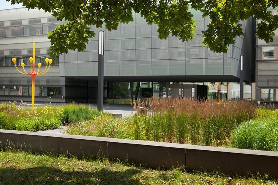 Zwischen Bestand und Neubauten entsteht der zentrale Platz als neue Mitte. Dieser Campus ist streng und elegant formuliert als plattenbelegter Platz mit pflanzlichen Intarsien. Gräser und grasblättrige Blütenstauden sind in systematischen Gruppen wie im Sichtungsgarten arrangiert. Die Skulpturengruppe „Funken“ von Chili Seitz thematisiert Formationen der bei der BAM angewandeten Schleiffunkenanalyse.