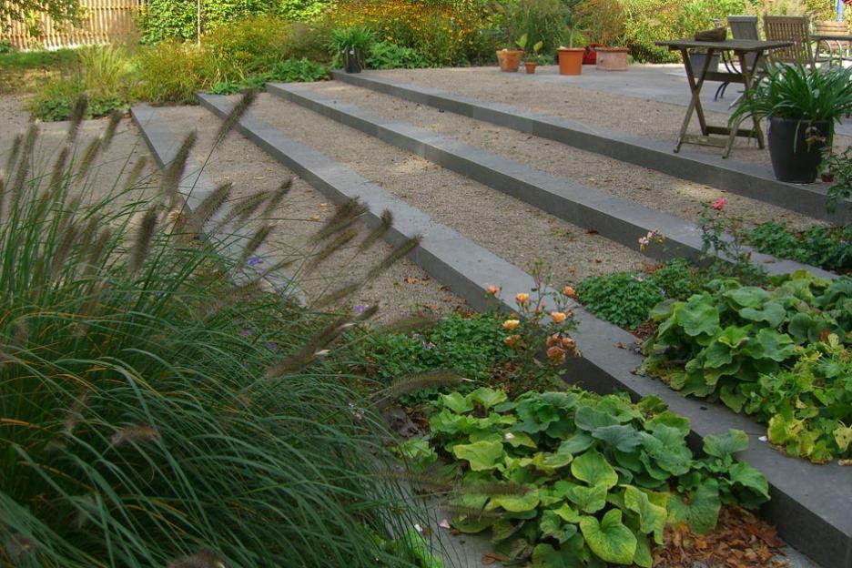 Der Garten selbst bildet in seiner strengen Gliederung einen Kontrast zum landschaftlichen Park. Den Mittelpunkt bildet ein minimalistisch detaillierter Pool, der mit steinernen Stufen und Rasenterrassen in das abfallende Gelände eingebettet ist. Gefasst ist der Raum durch ein monolithisches Ensemble aus Gartenmauer und Badehaus aus Sichtbeton. Zur Dorfmitte hin entstand ein abgetreppter Blumen- und Gemüsegarten mit baumbestandenem Sitzplatz.
