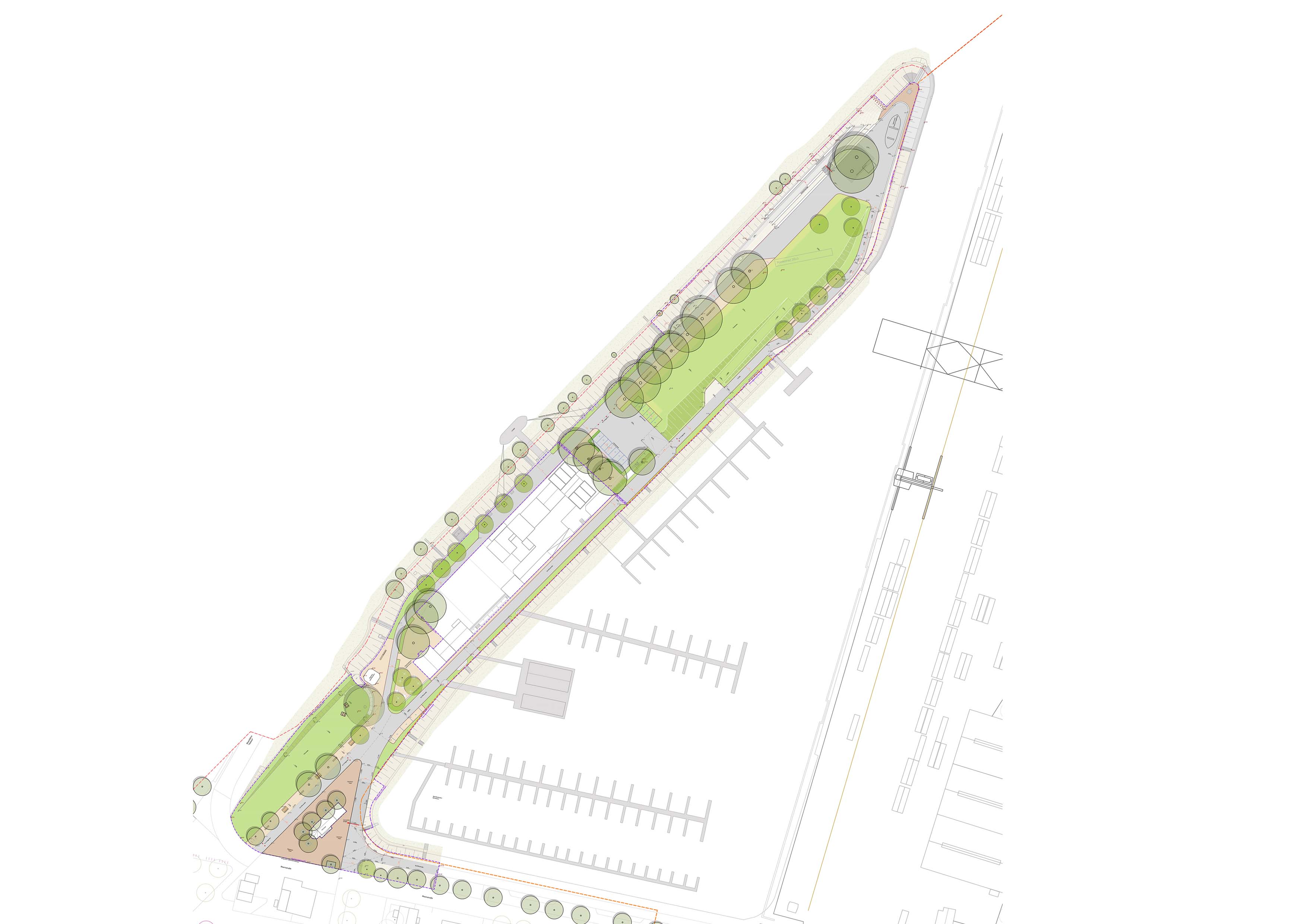 Mit der Neugestaltung der Hafenspitze in Gernsheim wird ein bislang funktional geprägter Ort zu einem hochwertigen, öffentlich zugänglichen Freiraum transformiert. Der ehemalige Parkplatz weicht einem offenen Promenadenpark mit großzügiger, grüner Mitte. Ziel ist es, die Hafenspitze als besonderen Ort am Wasser neu erlebbar zu machen und als identitätsstiftenden Bestandteil des Rheinufers zu stärken.