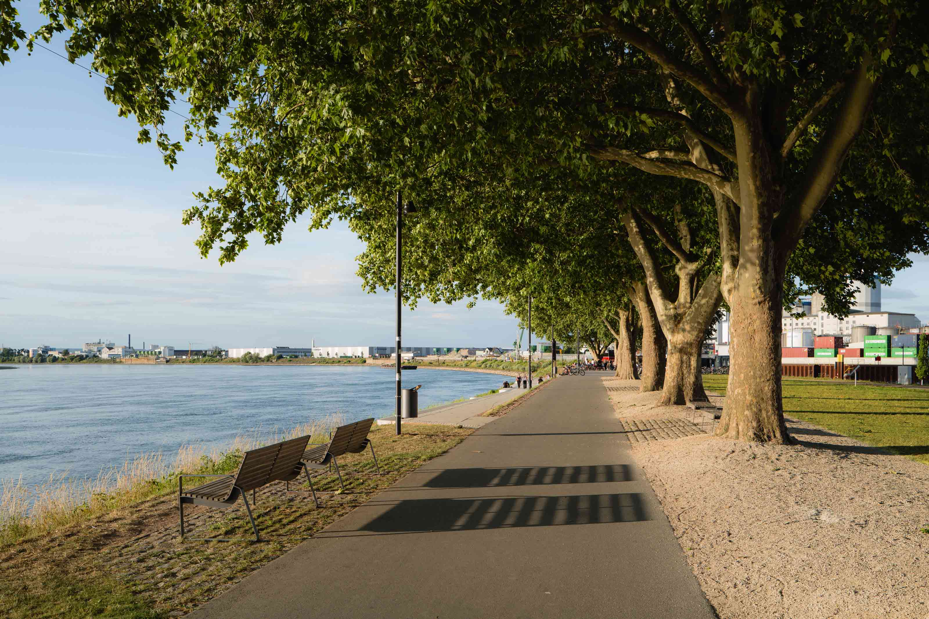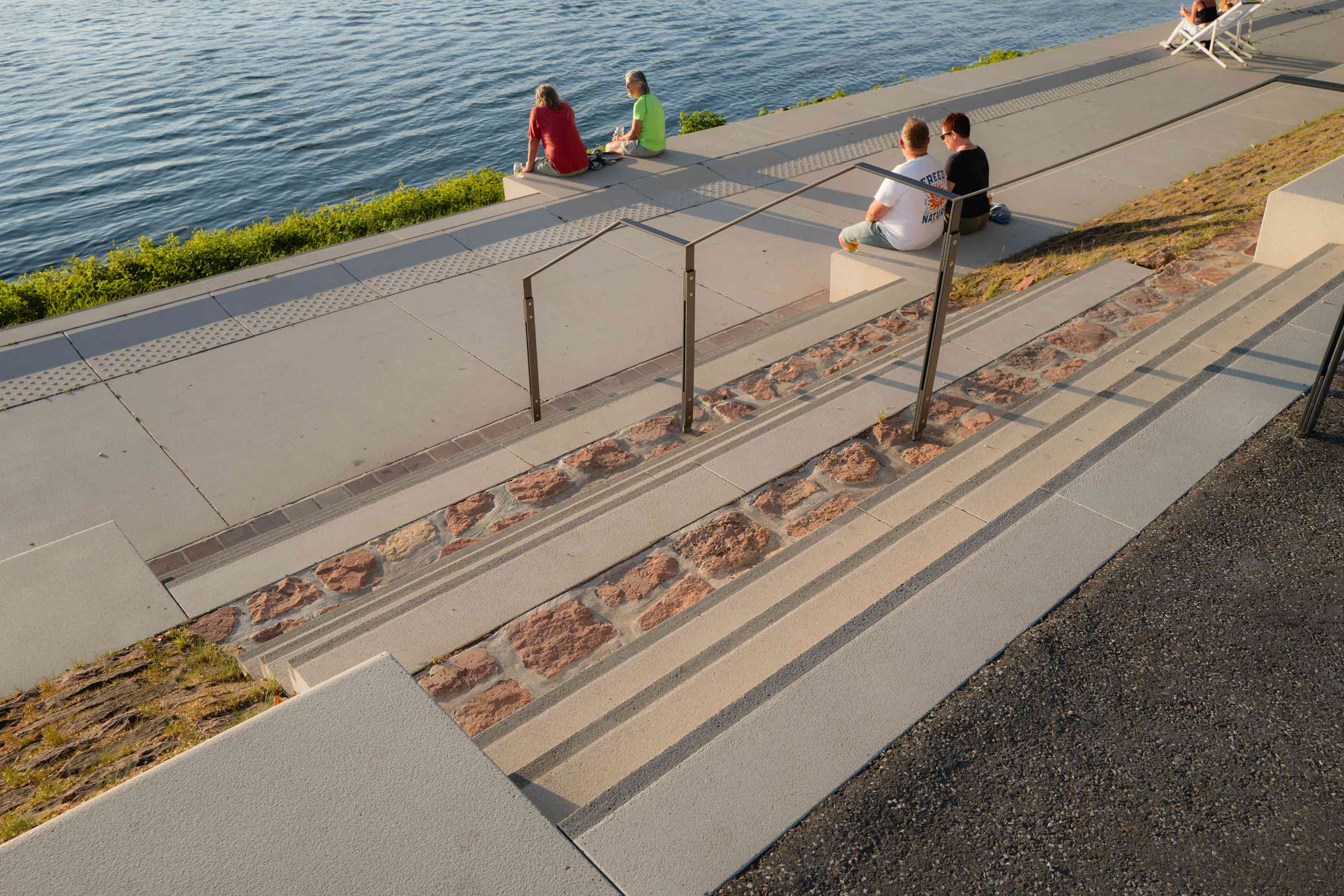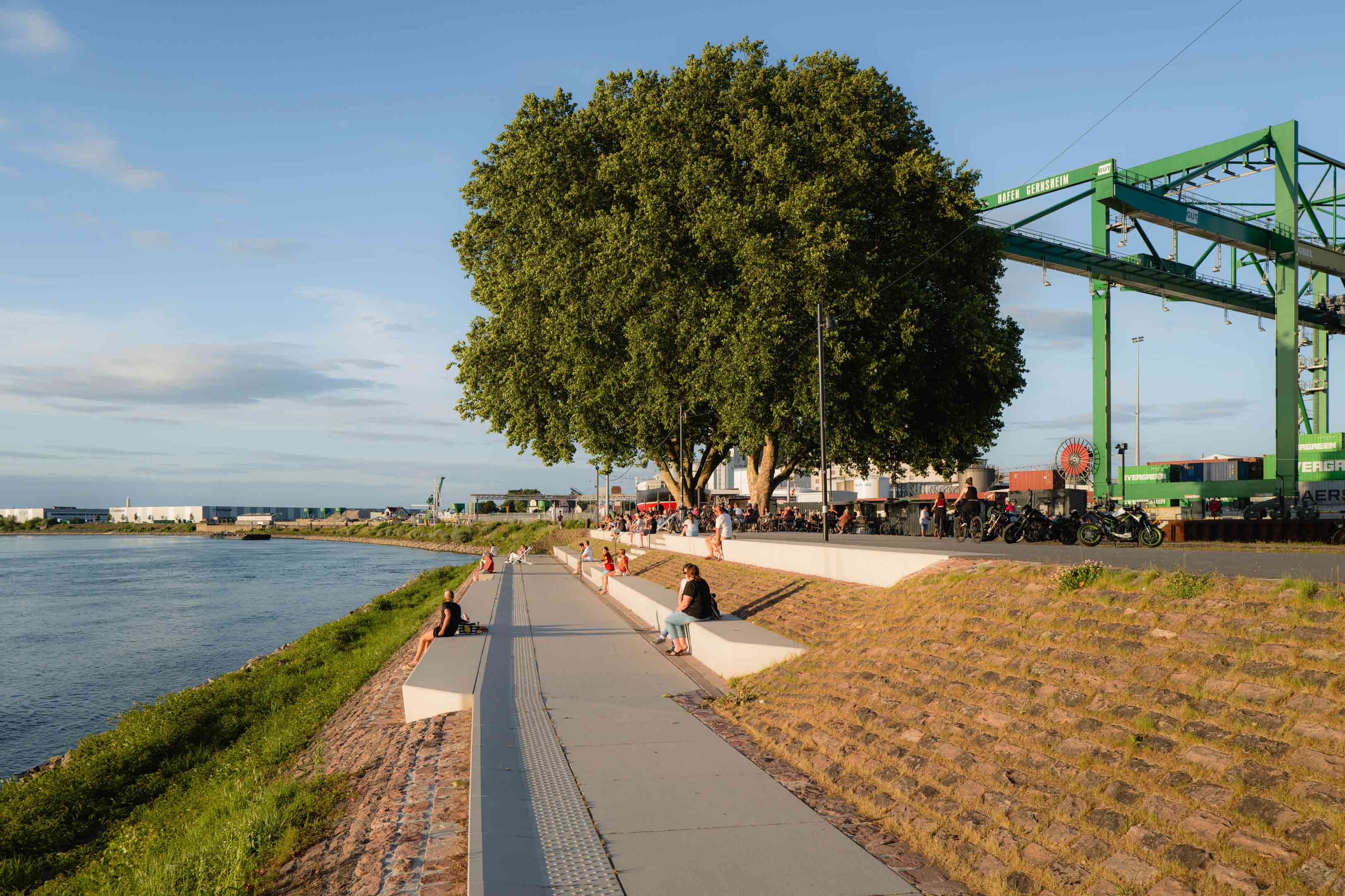 Anstelle ruhenden Verkehrs entsteht eine vielseitig nutzbare Rasen- und Aufenthaltsfläche für Erholung, informelle Nutzung und Veranstaltungen wie das Fischerfest. Eine bugartig ausgeformte Platzsituation mit Sitzstufen zum Rhein ermöglicht unmittelbare Wassernähe und macht die Hafenspitze erstmals als Zielpunkt erfahrbar.