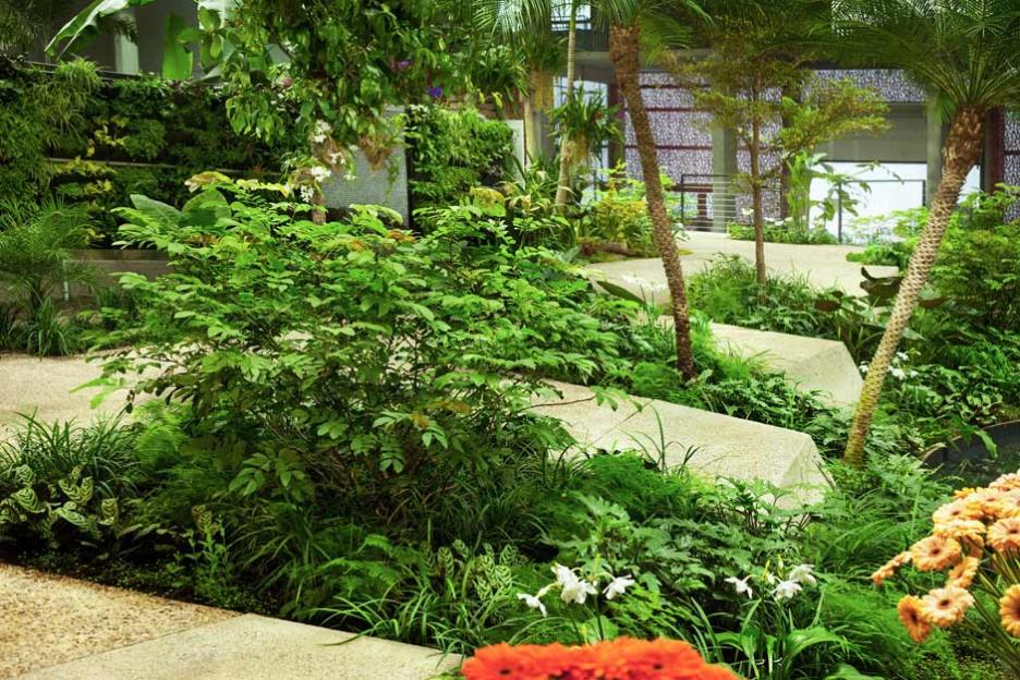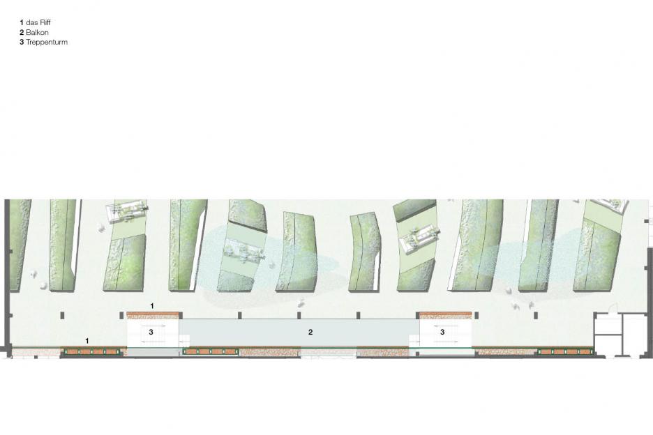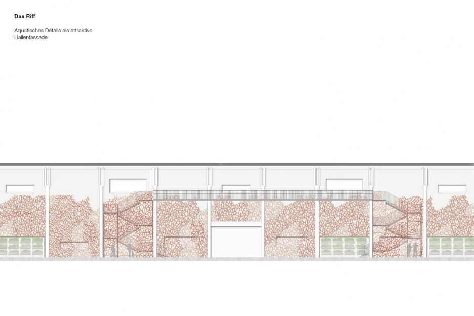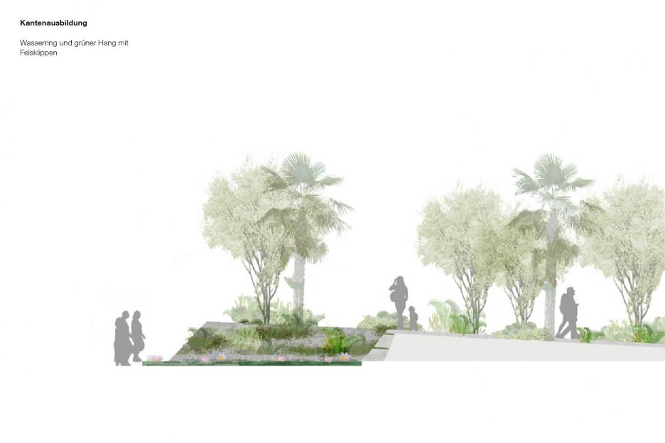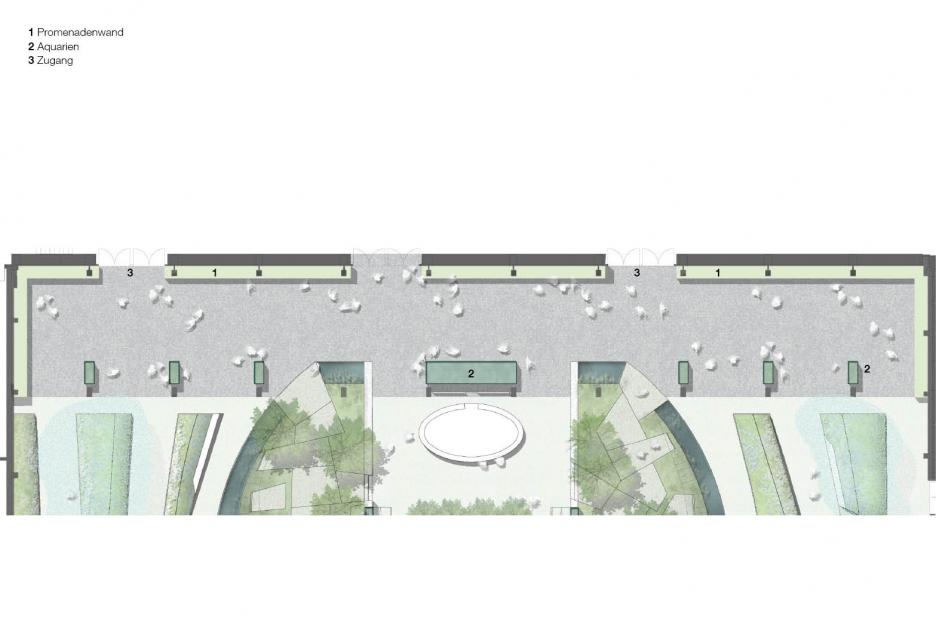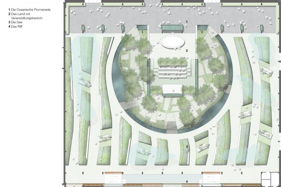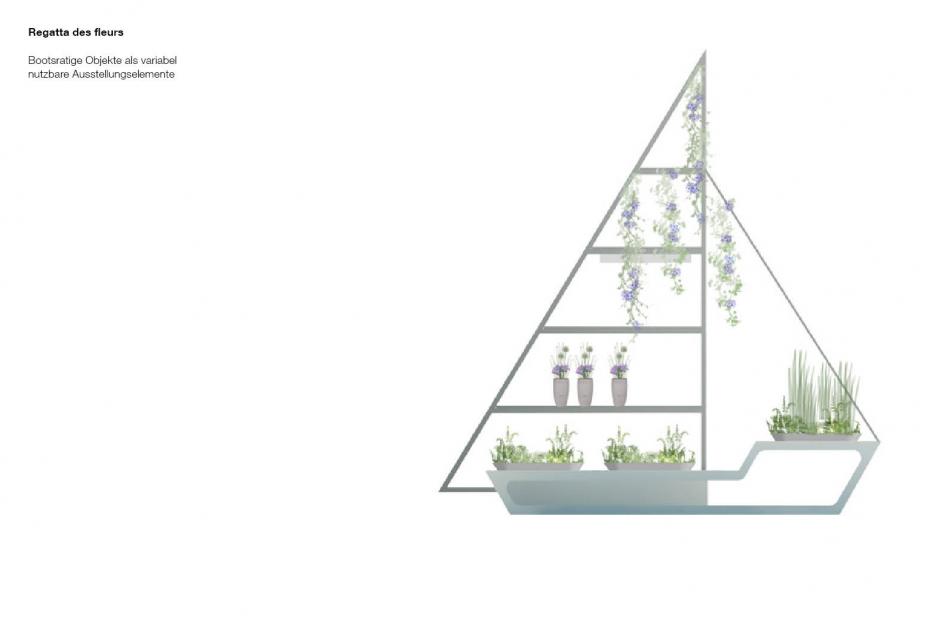 Der Haupthalle versetzt den Besucher an einen exotischen, maritimen Schauplatz. Eine palmenbestandene Klippeninsel, blau-türkise Wellenkämme, eine raumhohe Korallenwand als Blickfang und Hintergrund. Das enorme Volumen der künftigen Basketballhalle wird spielerisch für flirrende Wolkenformationen genutzt. Ausstellungsmöbel, geformt wie Genuesersegel dienen einer „regatta des fleurs“. Von den Booten scheinen die Pflanzen ihre Reiseerlebnisse herüber zu wispern. Die Ozeanische Promenade mit sieben Aquariensäulen am Eingang berichtet von Reiserouten der Pflanzen und den Abenteurern die sie zu uns brachten.