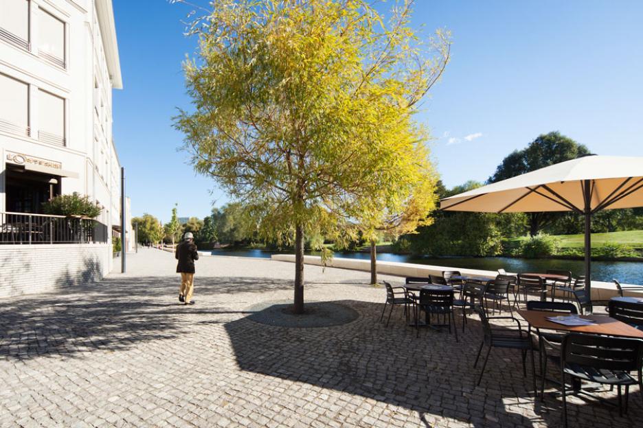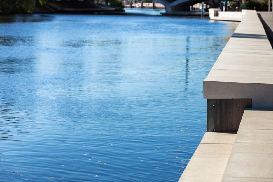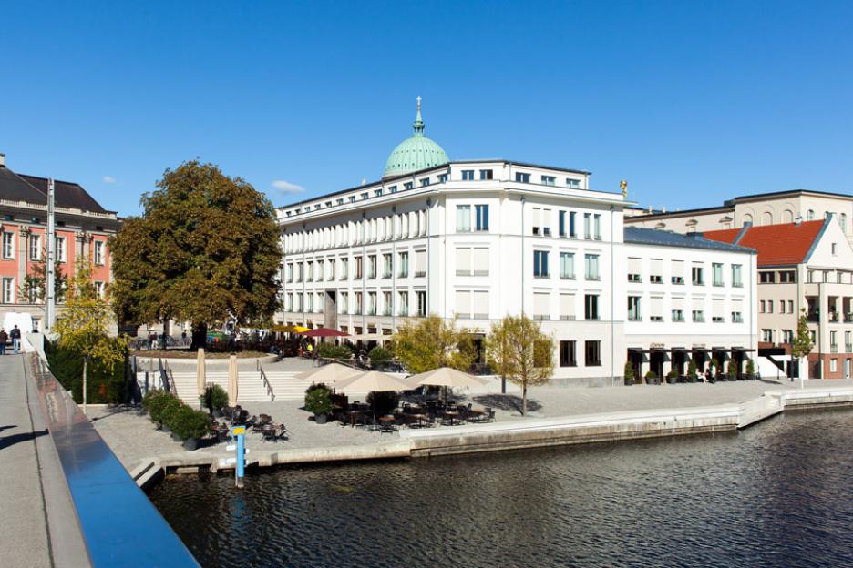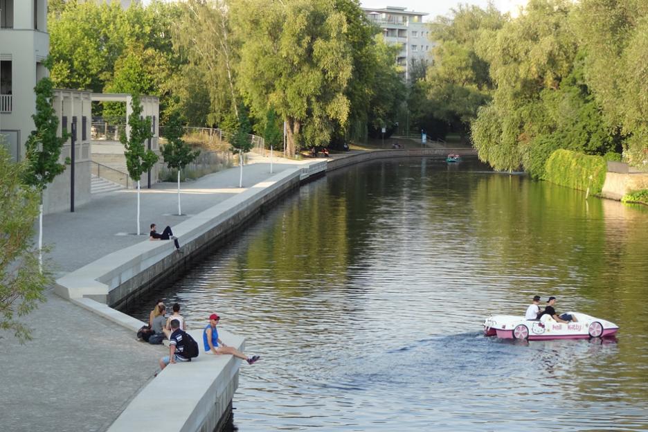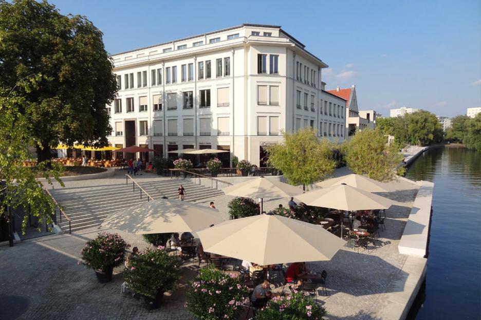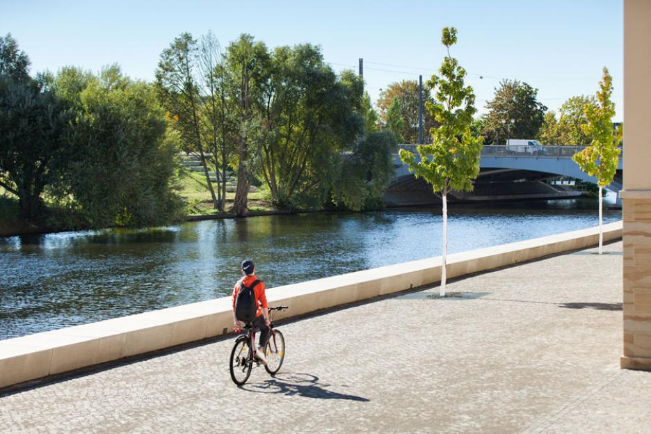 Stadtplatz und Gartenplatz. Die Dramaturgie von Wasserebene und Stadtebene. Das steinerne Ufer vor der grünen Kulisse der Freundschaftsinsel.