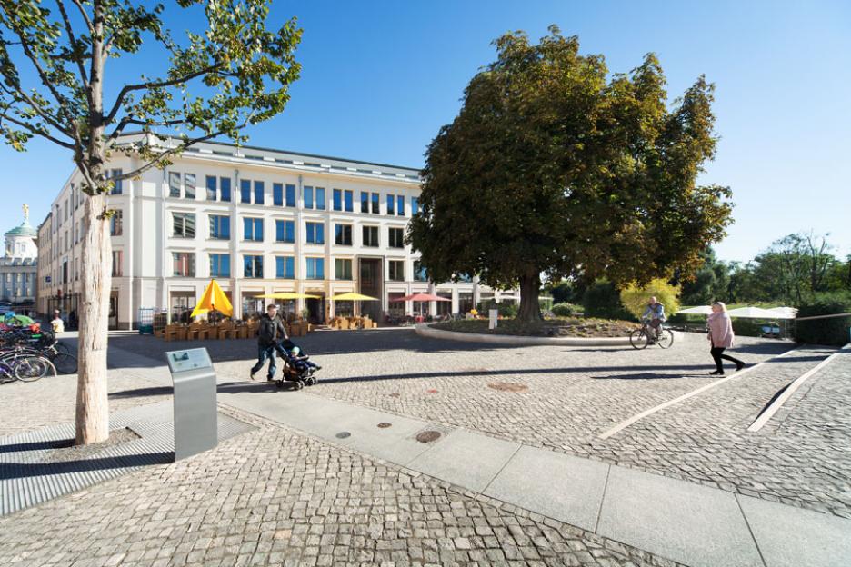 Der östliche Kopf des Ensembles, der "Versailler Platz" (früher Brauerplatz), wird nach seiner Fertigstellung den Übergang zu den angrenzenden Parkanlagen bilden.