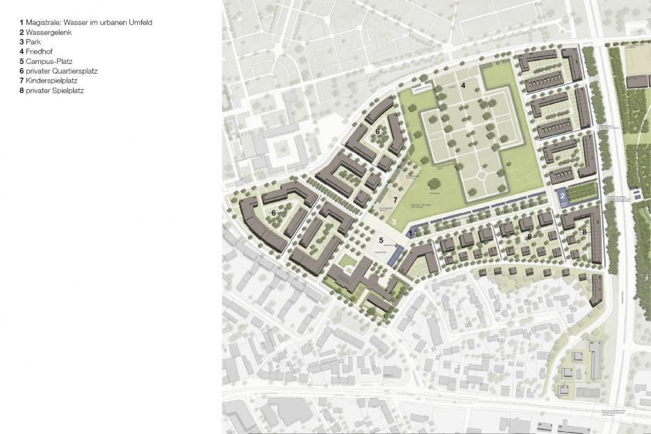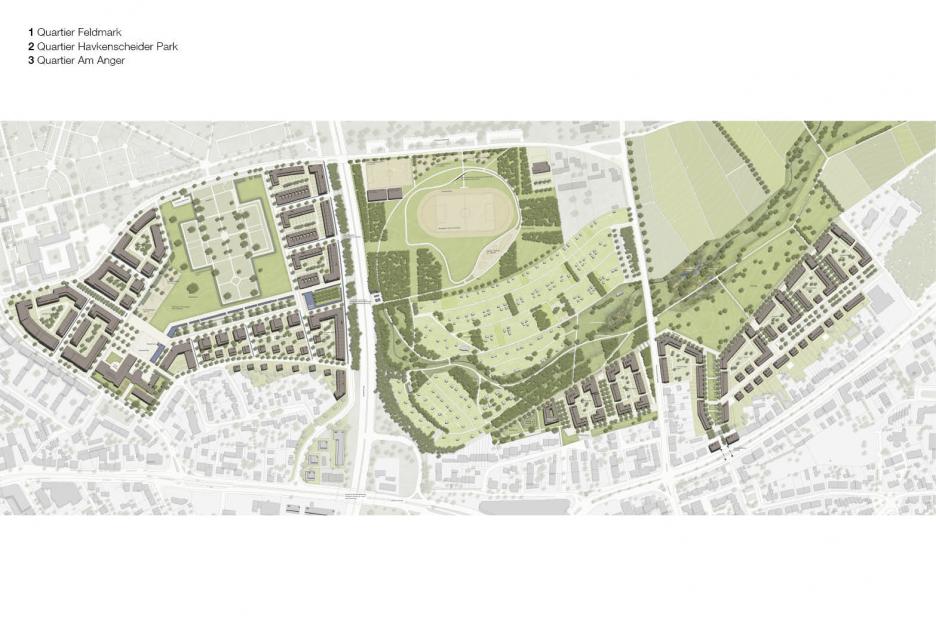 Die Aufgabe zur Gestaltung des entstehenden Wohngebietes enthält einige exemplarische Elemente für die Struktur des Ruhrgebiets. Dabei kommt der Durchdringung des Plangebietes mit Freiraum ein großer Stellenwert zu. Sie nimmt zudem Bezug auf die außerordentlich langen Siedlungsränder mit ihren fraktalen Formen, der Fülle an isolierten Infrastruktureinrichtungen an die es Anschluss zu finden gilt, sowie dem dichten Netz der Hochleistungsstraßen. Gleichzeitig wird die Verknüpfung von Städtebau und energetischem Status Quo gesucht und mit der Landschaft zusammengeführt. Damit gibt es kein klassisches „Innen“ und „Außen“ in diesem Siedlungsraum. Es gilt vielmehr, die spezifischen Qualitäten von ‚Stadt‘ und ‚Freiraum‘ herauszuarbeiten und für eine attraktive wie nachhaltige Entwicklung fruchtbar zu machen. Im Dialog mit Wasserwirtschaftlern werden freiräumliche Qualitäten durch die Offenlegung und Einspeisung von Regenwässern gestärkt, es klingen unterschiedliche Wasseratmosphären an.