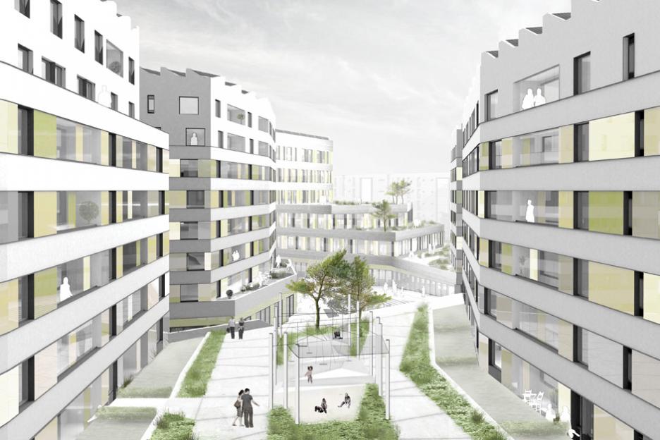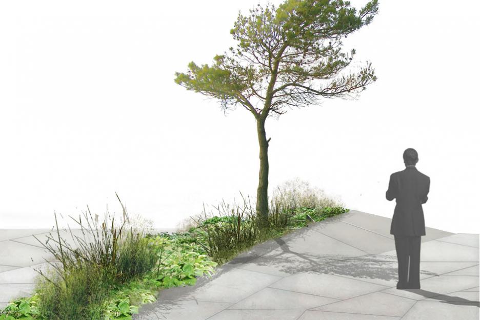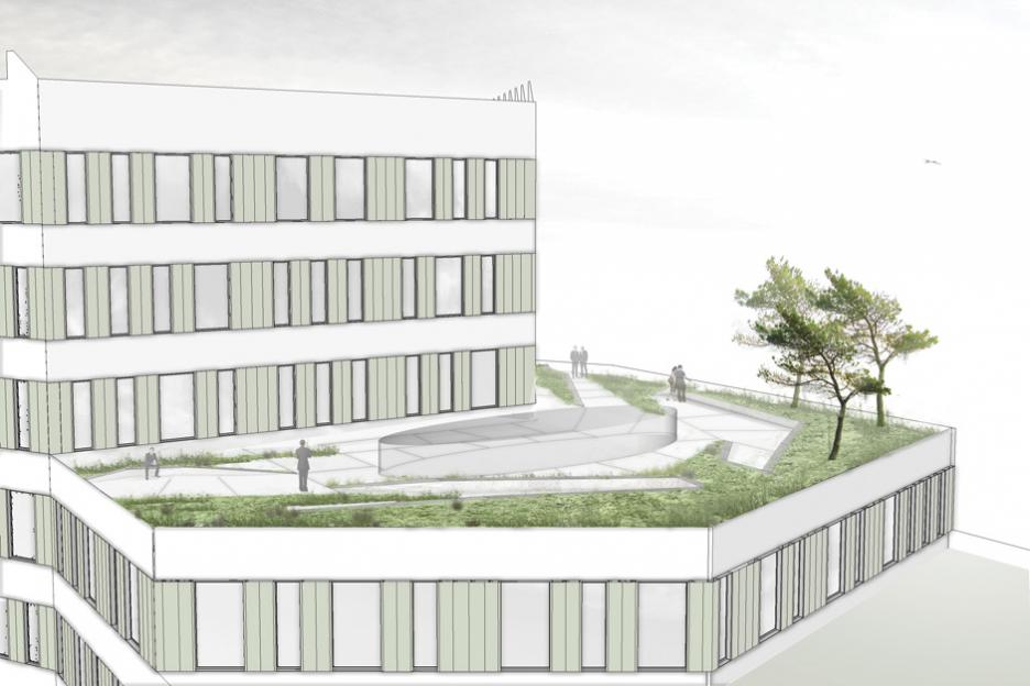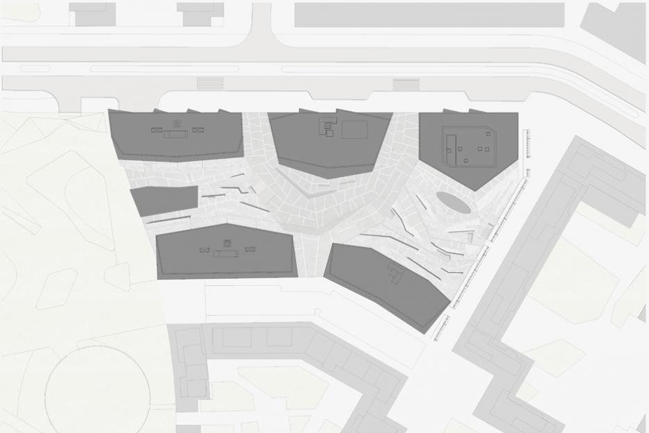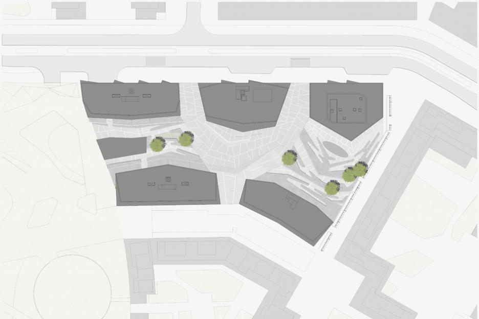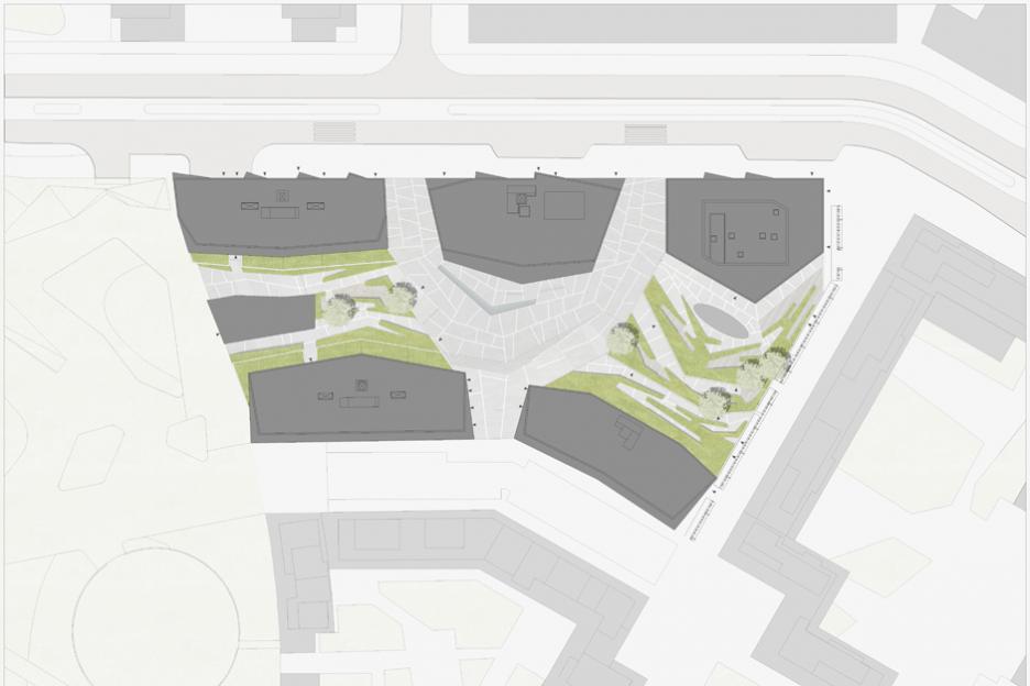 Der Freiraum beinhaltet drei Typologien für die eine einheitliche Gestaltsprache entwickelt wird, welche die Gliederung durch unterschiedlichste Nutzungen und Anforderungen visuell zusammen zieht. Wie sieht ein von der finnischen Landschaft inspirierter urbaner Freiraum aus? Er transportiert die Idee von zerklüfteten Felsen und Vegetationsfugen auf artifizielle Topografie, spielt mit dem Bild von Substratansammlungen als Habitat von Bäumen und Wasseransammlungen in Felsfugen.