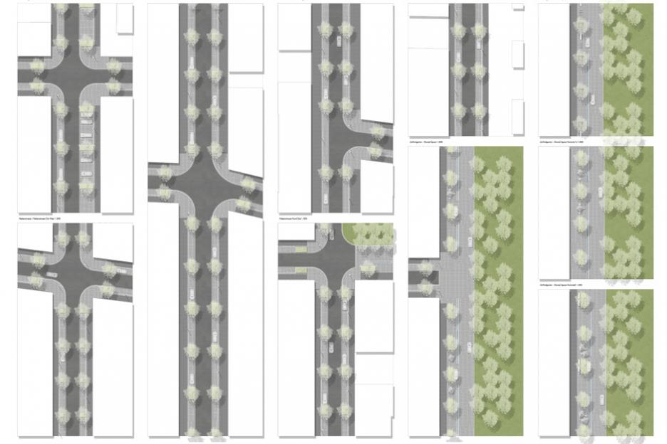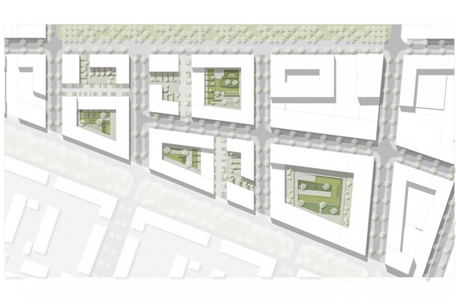 Die vorgeschlagene bauliche Struktur erzeugt ein differenziertes System städtischer Räume. Ist die Entwicklung des Gebiets abgeschlossen, zeichnet es sich durch einen sorgfältig formulierten Kanon aus öffentlichen, halb-öffentlichen und privaten Räumen aus.