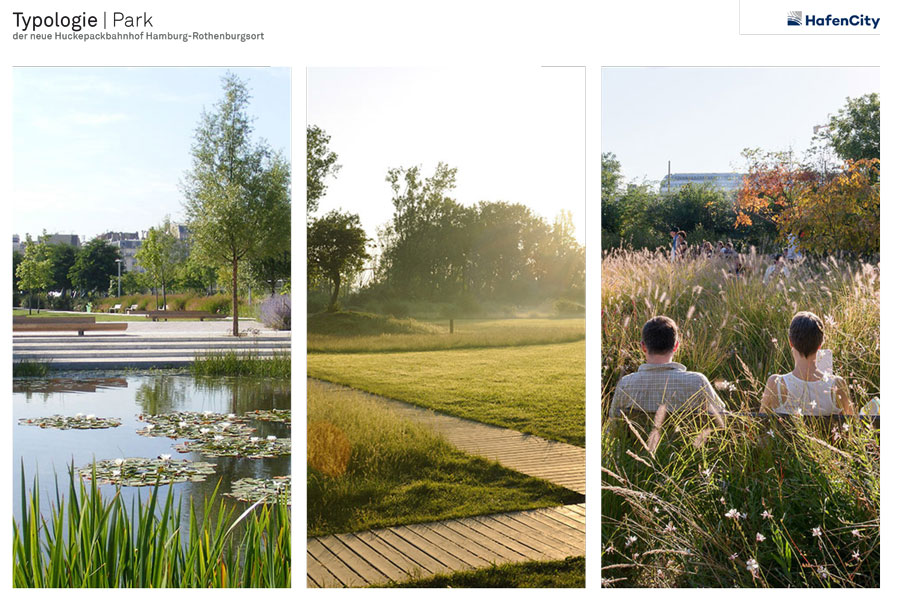 Definiert und untersucht werden in diesem Sinne Erschließungsstraßen, der Gewerbeboulevard mit zentralem Platz an der Querung zum Bille-Grünzug, der Grünzug mit Unterführung, das Umfeld nördlich der Billstraße, die Logistikstraße im Süden des Areals, der Terrassen-Park an der Bille, Dachlandschaften und Höfe.