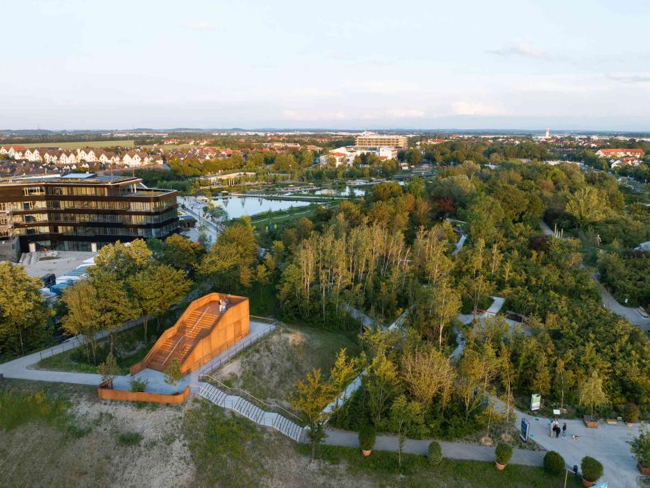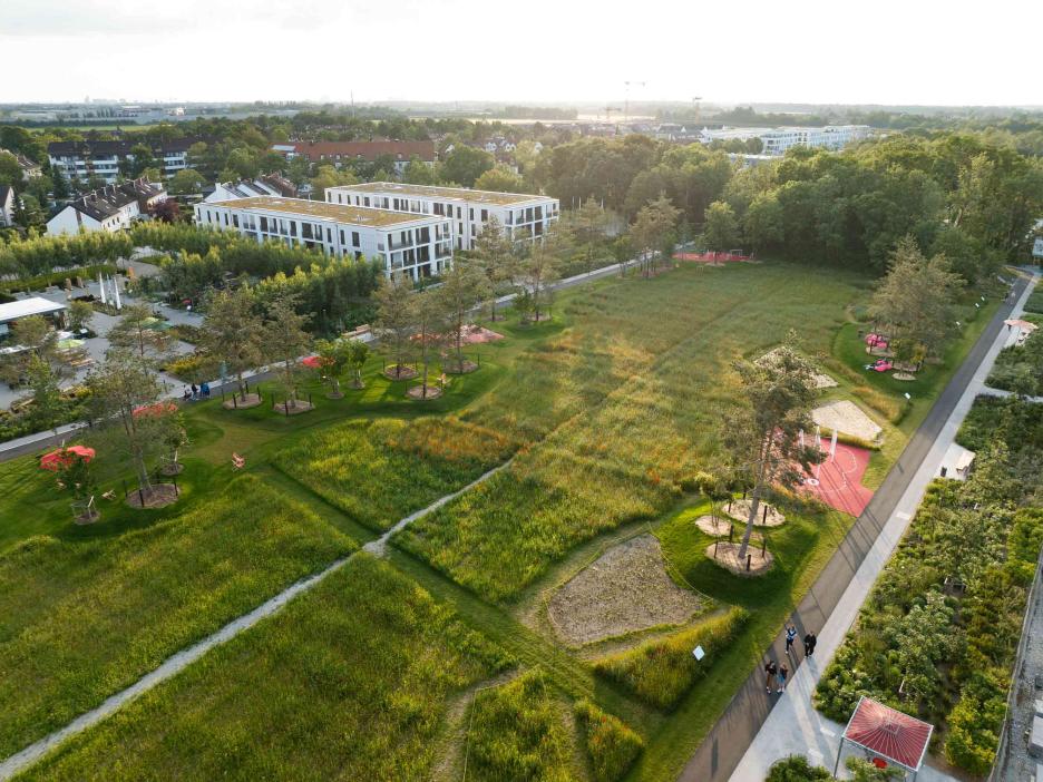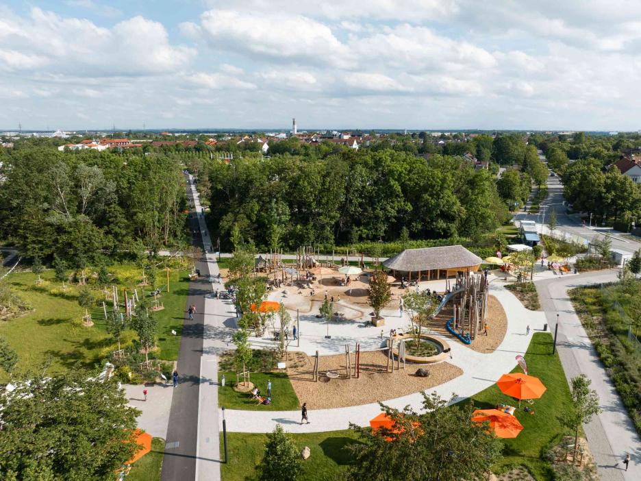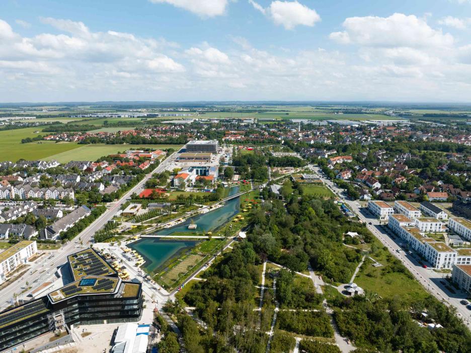 Flankiert von Wohnbebauung und öffentlichen Bauten wie einem neuen Rathaus, Schulen und Kitas, wird mit dem Park eine neue Ortsmitte entstehen. So können die bisher getrennten Gemeindeteile Kirchheim und Heimstetten zusammenwachsen.