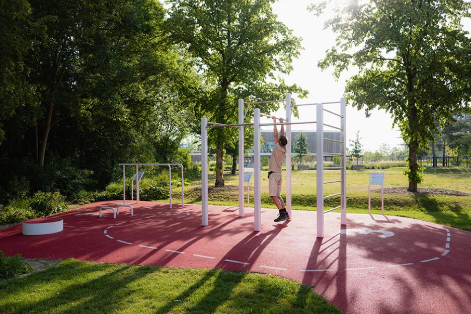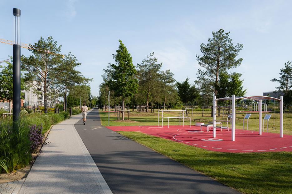 Zusammengebunden werden die Parkteile durch eine starke zentrale Erschließungsschleife in Form einer verzerrten Acht („der Achter“). Die neuralgischen Stellen werden von Plätzen flankiert. Alle öffentlichen Einrichtungen liegen am Achter an, Traversen verknüpfen den Park mit dem Stadtraum.
