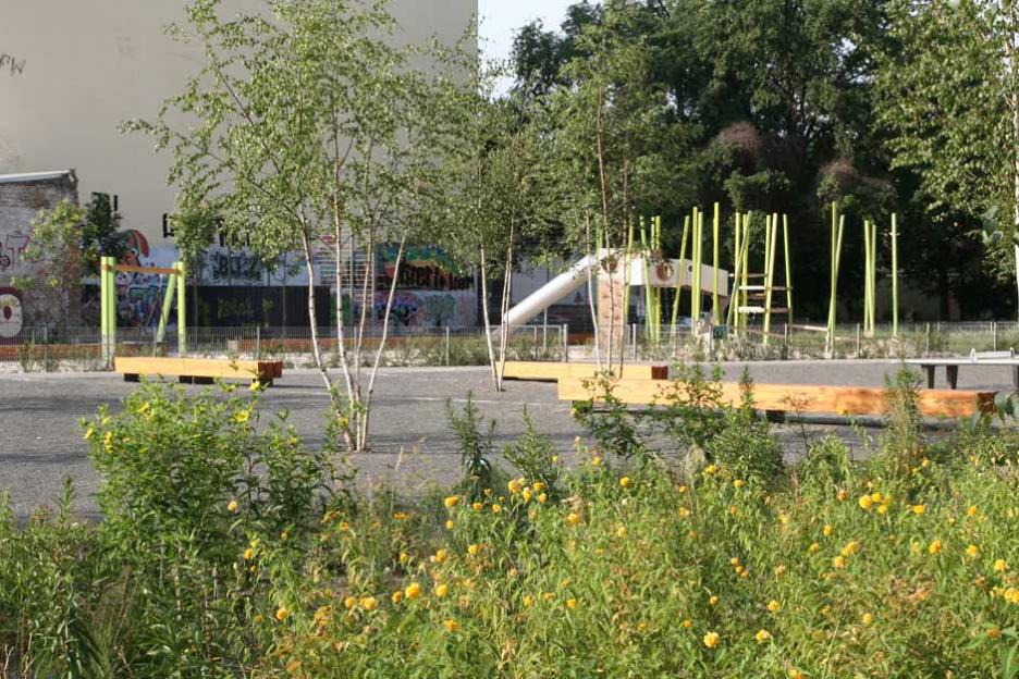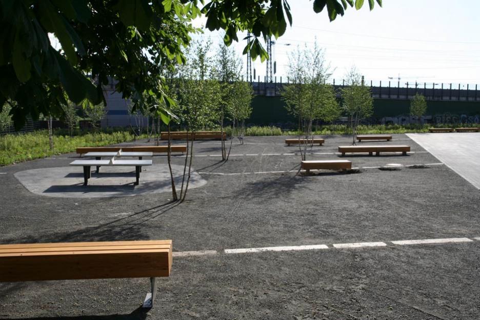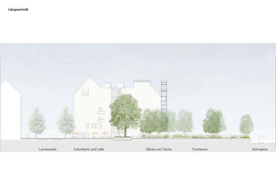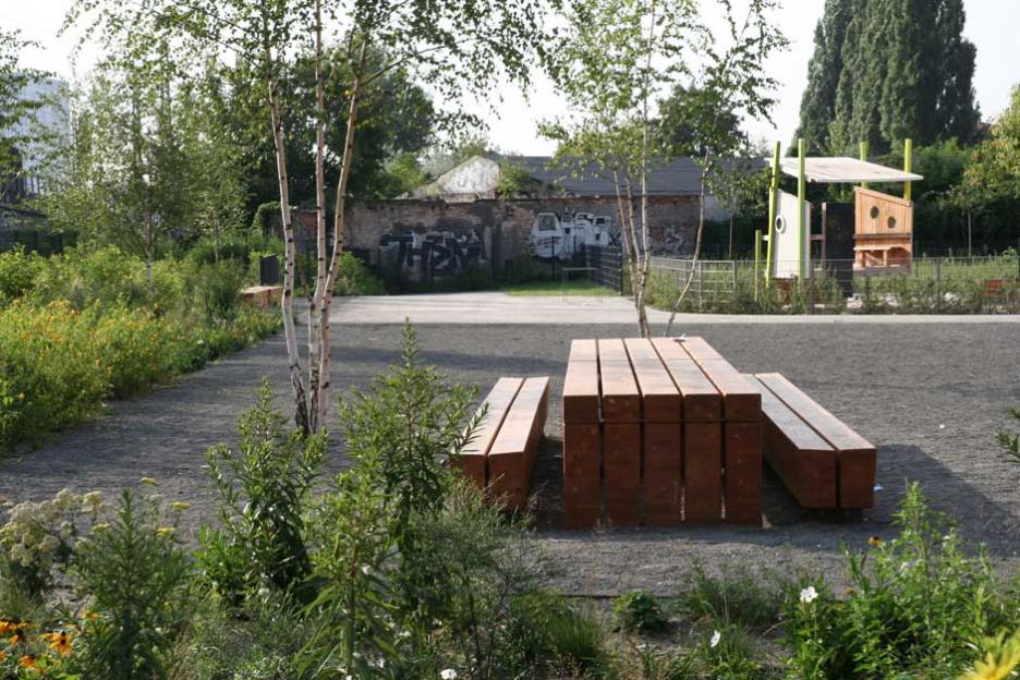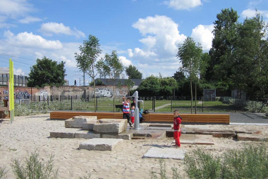 Der Spielplatz im Süden wirkt mit seinen farbigen Spielskulpturen signalhaft im Stadtraum. Gewaltige Steinblöcke, Fundstücke aus der vormaligen Nutzung, bilden eine Wasser- und Kletterlandschaft.[nbsp] Eine mächtige Kastanie eröffnet den Platzbereich im Norden, der von der Kulturfabrik künftig gastronomisch bespielt wird. Dahinter spendet ein lichter Birkenhain Schatten über den schweren Bank- und Tischblöcken aus Douglasie. Im ruhigen Teil der Anlage wird ein Gemeinschaftsgarten eingerichtet.