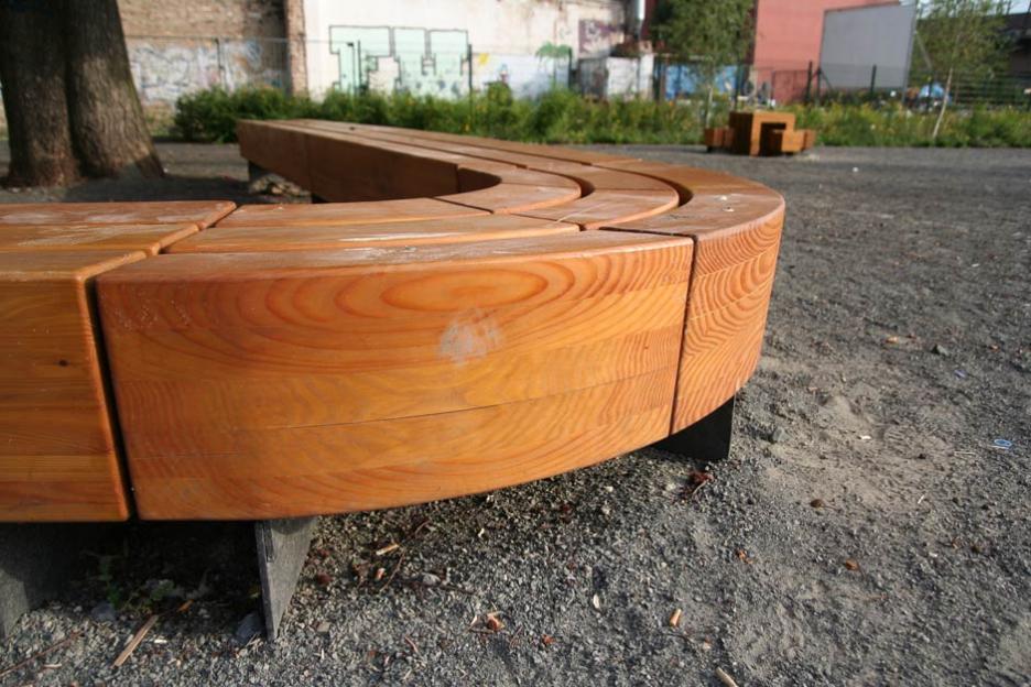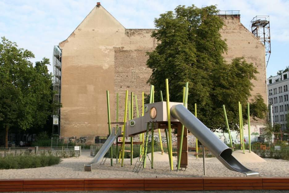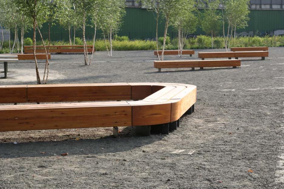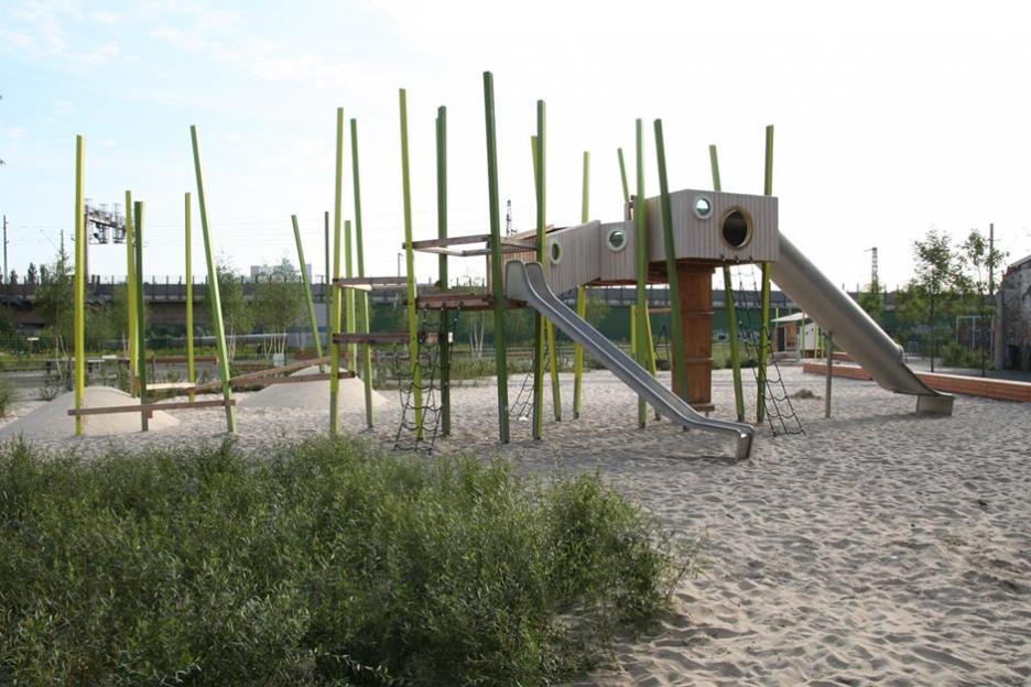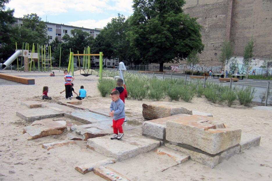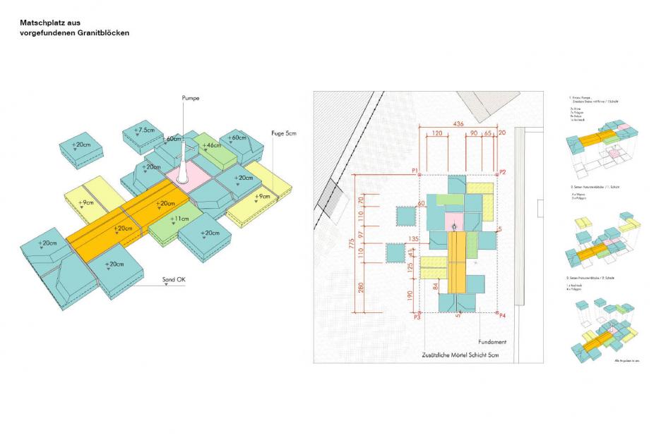 Der Spielplatz im Süden wirkt mit seinen farbigen Spielskulpturen signalhaft im Stadtraum. Gewaltige Steinblöcke, Fundstücke aus der vormaligen Nutzung, bilden eine Wasser- und Kletterlandschaft.[nbsp] Eine mächtige Kastanie eröffnet den Platzbereich im Norden, der von der Kulturfabrik künftig gastronomisch bespielt wird. Dahinter spendet ein lichter Birkenhain Schatten über den schweren Bank- und Tischblöcken aus Douglasie. Im ruhigen Teil der Anlage wird ein Gemeinschaftsgarten eingerichtet.