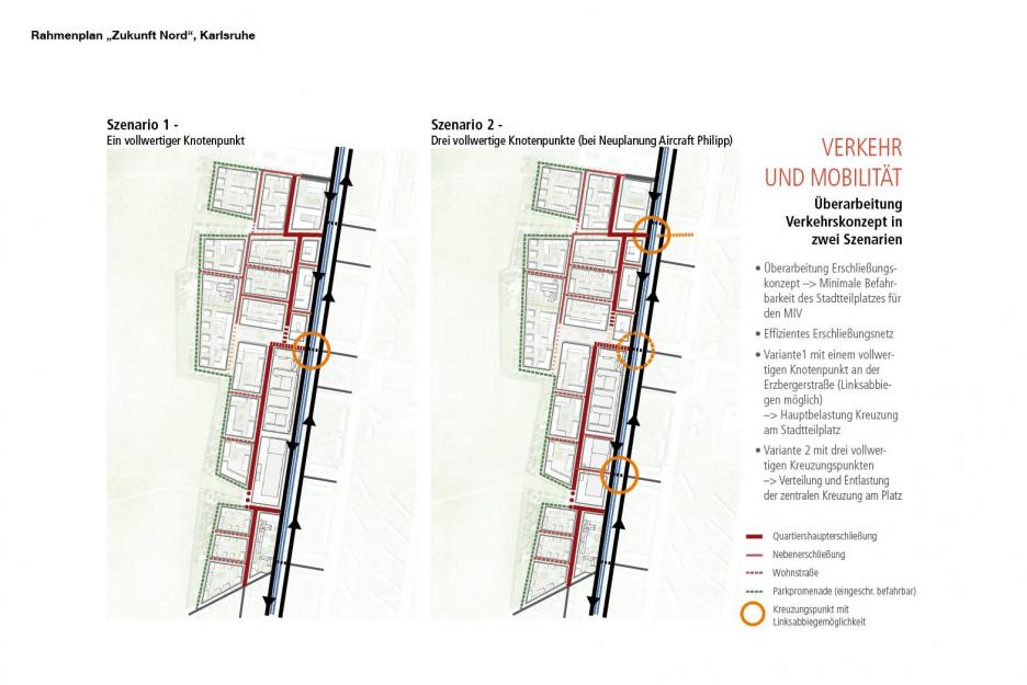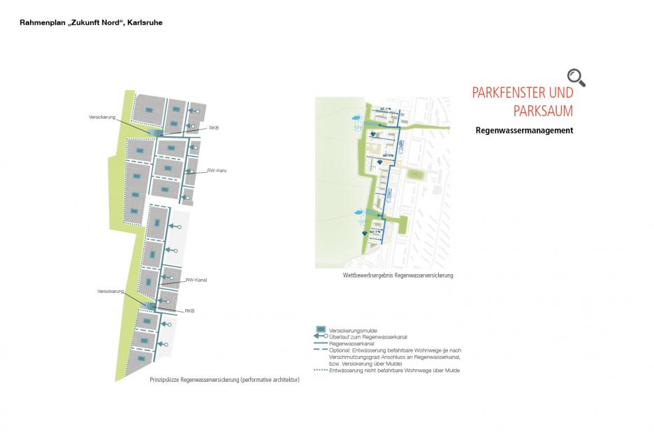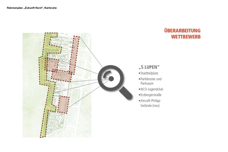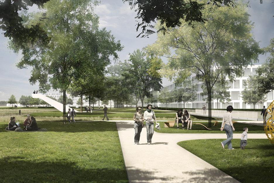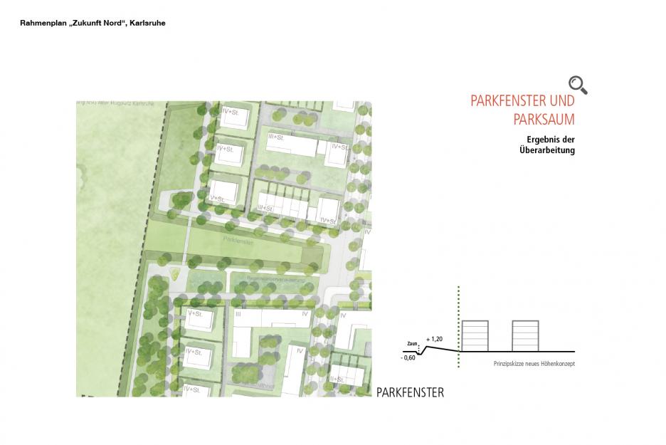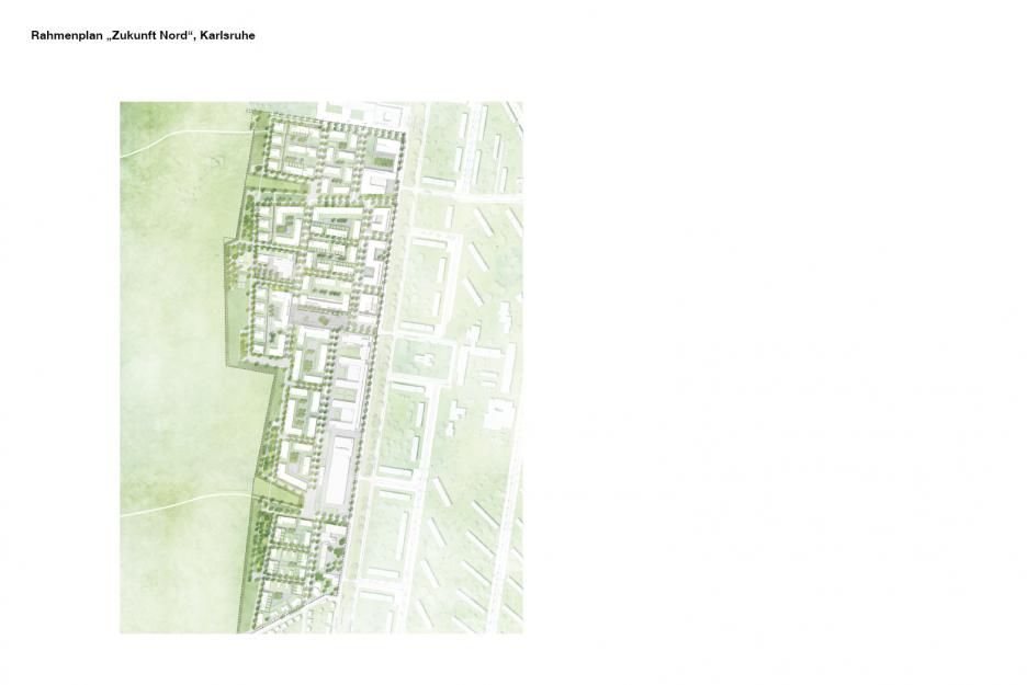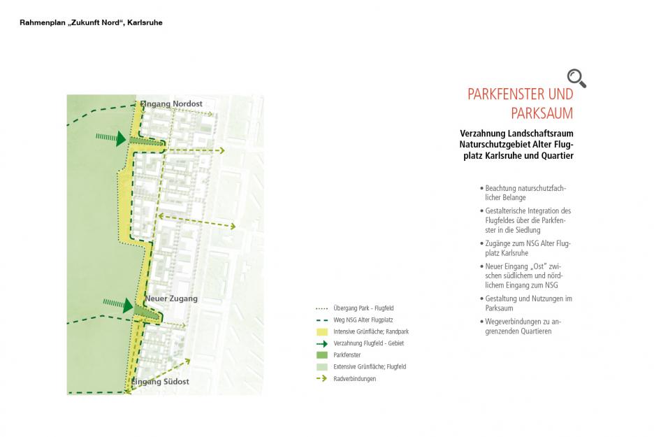 Es wird eine enge Verzahnung von Wohn- und Grünraum angestrebt wobei zum einen die Siedlungsgebiete durch die Zuordnung zum Naturraum des ehemaligen Flugplatzes optisch erweitert werden. Zum anderen holen zwei große Landschaftsfenster die Natur in die Stadt. Der erhöhte, intensiv nutzbare Randpark entlastet den bestehenden, geschützten Naturraum. Die verbleibenden Freiflächen im Siedlungsgebiet erhalten ein möglichst hohes Maß an ökologischer Qualität um somit einen Beitrag zur Minimierung des Eingriffes in bisher unbebaute Flächen zu leisten.