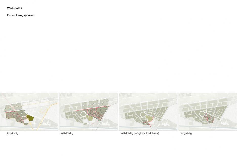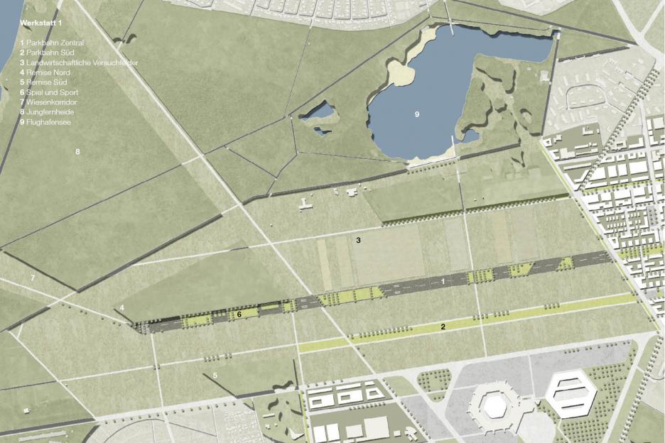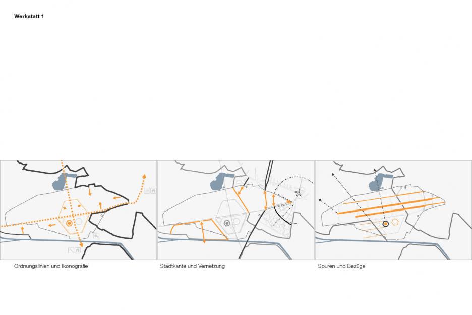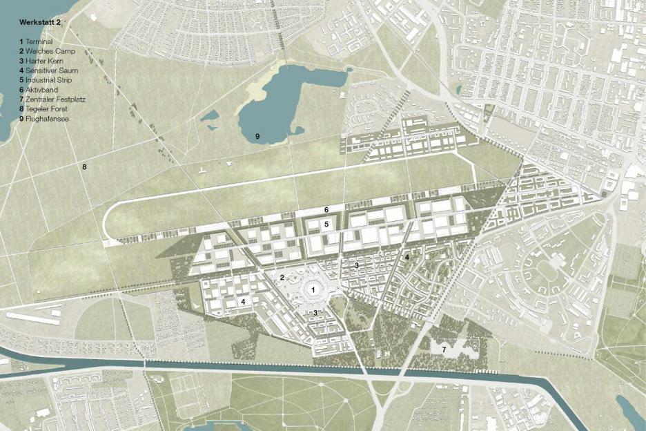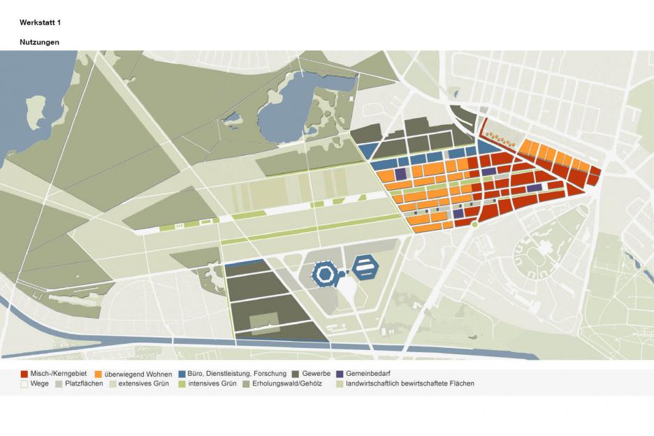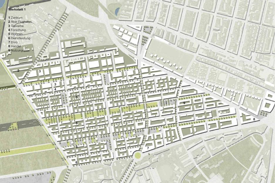 Die bauliche Entwicklung ist geprägt von einer differenzierten Ansprache geeigneter Stadtbausteine. Einem dichten städtischen Quartier (harter Kern) im Innern stehen Experimentierzonen auf dem Vorfeld und offene Siedlungsstrukturen in den baumgeprägten Randbereichen gegenüber (sensitiver Saum). Zwischen den Landebahnen werden raumwirksame landschaftliche Strukturen entwickelt. Die gewerbliche Entwicklung erfordert hier einen äußerst flexiblen und „duldsamen“ Rahmen.