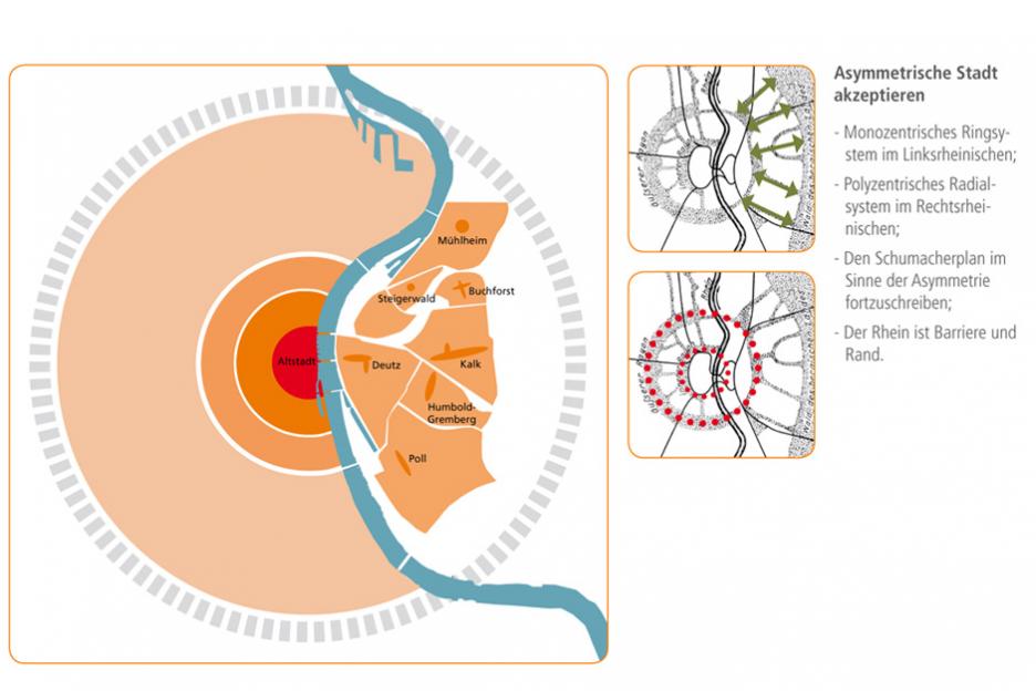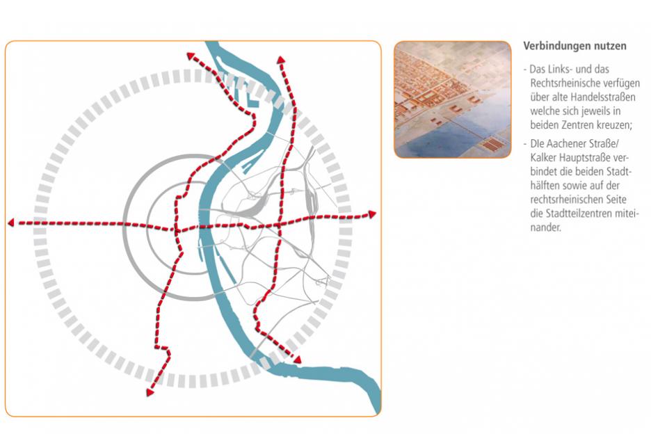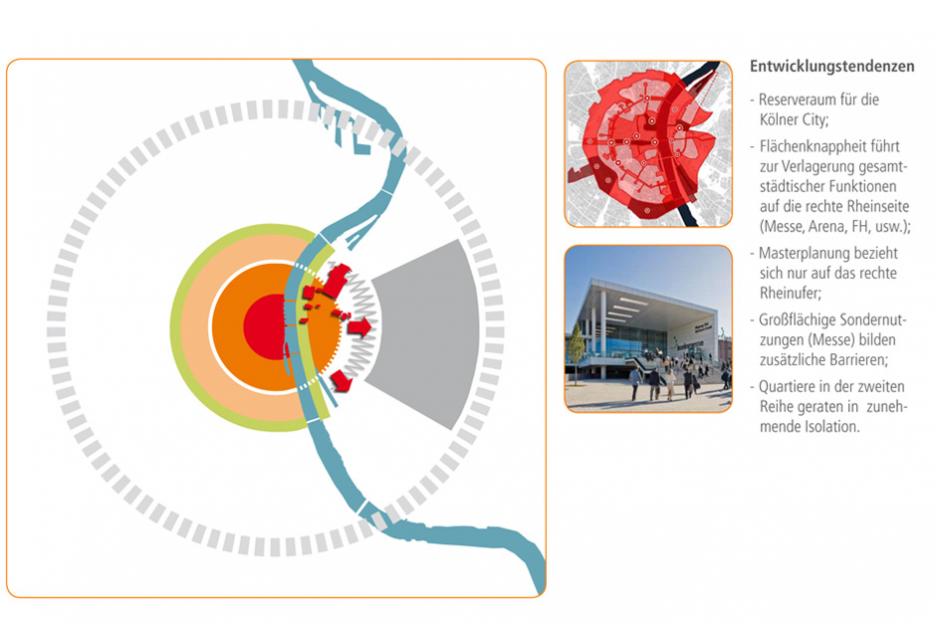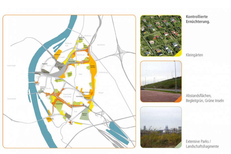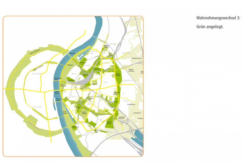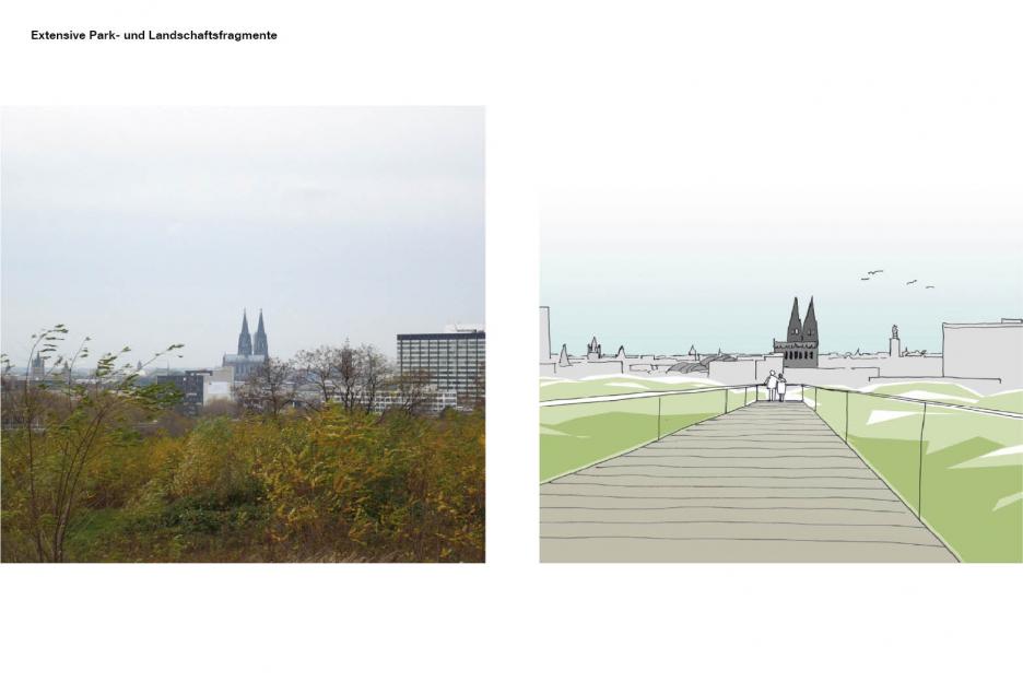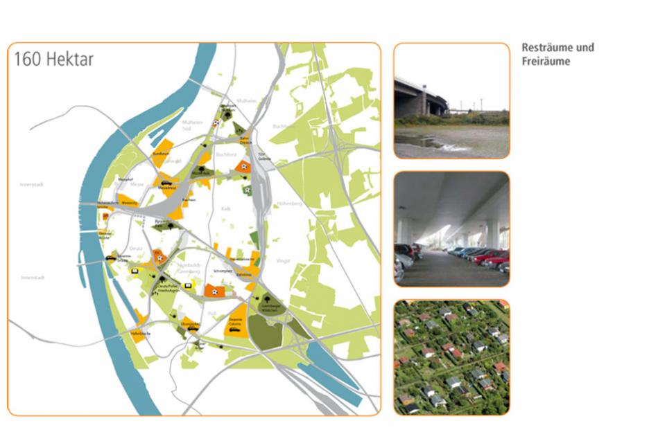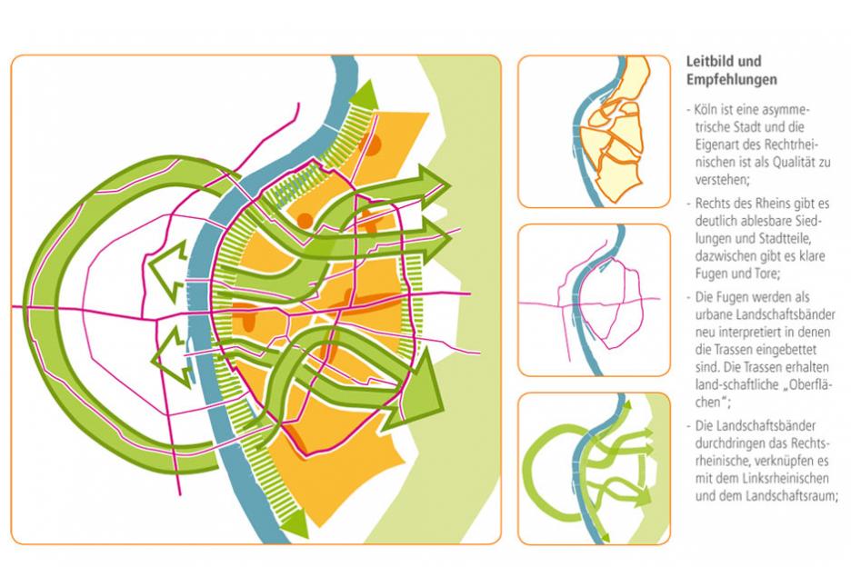 Das rechtsrheinische Köln wird geprägt von verkehrlichen Infrastrukturen. Bahn-, und Autobahntrassen gliedern das Gebiet in verschiedene Quartiere. Die mächtigste Barriere ist der Rhein, der das Links- vom Rechtsrheinischen trennt. Dazu trennen großflächige Nutzungen auf gesamtstädtischer Ebene wie die Messe, die sich direkt am Rhein angliedert und die rechtsrheinischen Quartiere zusätzlich von der linksrheinischen Kernstadt abschotten. Die bestehenden Trassenkörper bieten hingegen im Zusammenhang mit ihren Begleiträumen wie Kleingärten und Brachflächen die Möglichkeit, diese Verbindungsfunktion neu zu interpretieren. Von der Schaffung neuer Blickbeziehungen und grüner Raumkulissen über die Weiterentwicklung vorhandener Nutzungspotentiale bis hin zu einer neuen Art der „Stadtnatur“ werden viele Einzelbausteine unter einem Leitmotiv kombiniert. Die Aspekte einer nachhaltigen Erneuerung der Stadt im sozialen und ökologischen Sinn finden ihren Ausdruck im Leitmotiv der neuen Trassenparks.