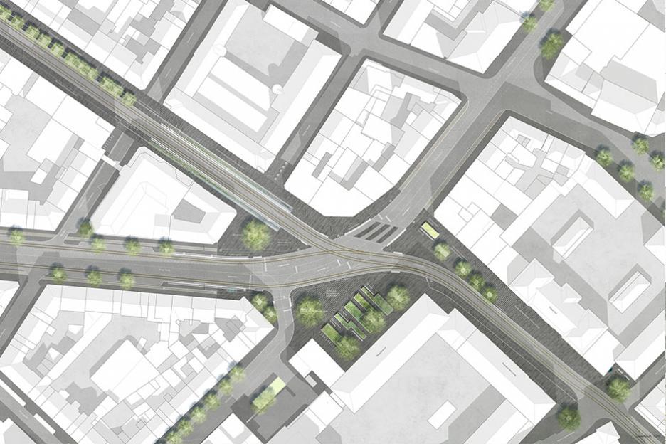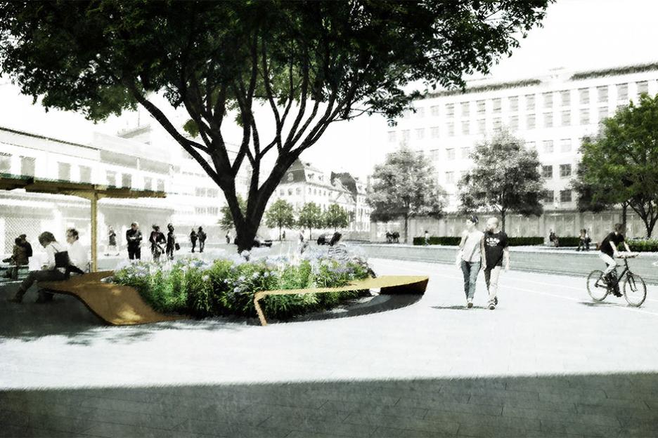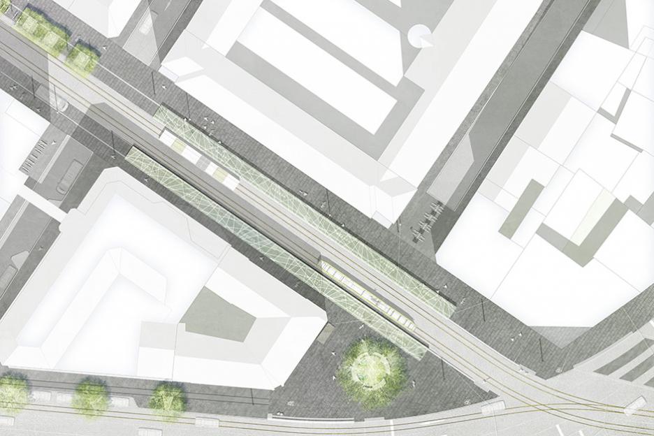 Der Boulevard verbindet die Plätze an seinen Enden, führt das Platanendach des Bahnhofsplatzes als aufgelockertes, lineares Band aus kastenförmig geschnittenen Linden in die Bahnhofstrasse. Auf Höhe der Haltestelle wird das organische, schwebende Dach transformiert, setzt sich als horizontale Scheibe aus grünlichem Glas, welches von einem "Geäst" aus Stahlprofilen getragen wird, fort.