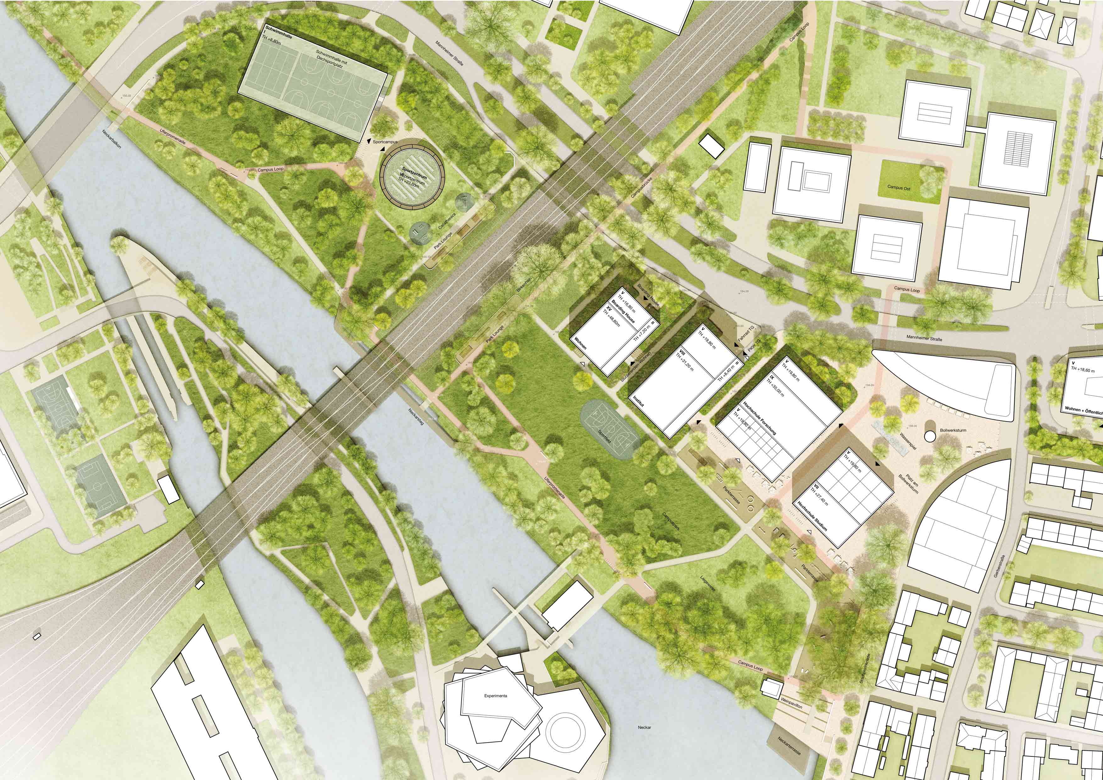 Der Entwurf formuliert einen kompakten Stadtcampus, der Bildung, Stadt und Landschaft zu einem offenen, lebendigen Stadtraum verbindet. Entlang der Mannheimer Straße entsteht ein klar gefasstes Campusband, das die Heilbronner Hochschullandschaft bis an die Innenstadt heranführt und zugleich den neuen Bleichinselpark als grünes Herz der Stadt öffnet. Die Bebauung konzentriert sich bewusst an den Rändern, während ein großzügiger, öffentlicher Park als durchgehendes grünes Kontinuum zwischen Innenstadt, Neckarufer und Campusflächen ausgebildet wird. Dieser nutzungsneutrale Freiraum bietet Raum für Erholung, Sport, Begegnung und studentisches Leben und integriert den wertvollen Baumbestand als identitätsstiftendes Rückgrat.