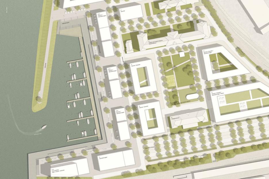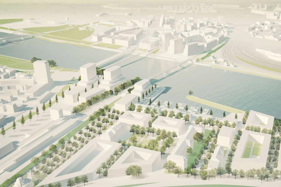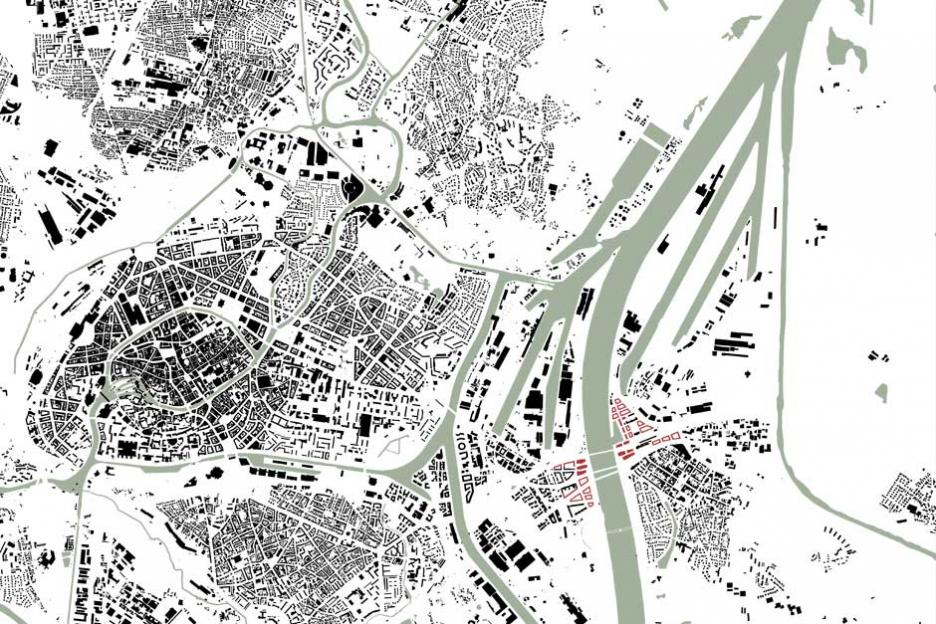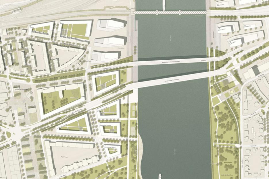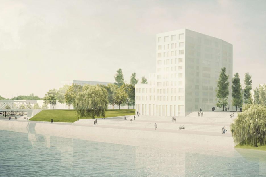 Places des deux Rives - Zwei Städte am Rhein werden über den Rhein zusammen geführt. Die Nahtstelle wird durch getreppte Plätze mit hohen, skulpturalen Gebäuden definiert, die eine integrative Stadtkante schaffen.