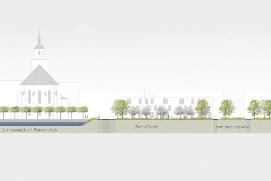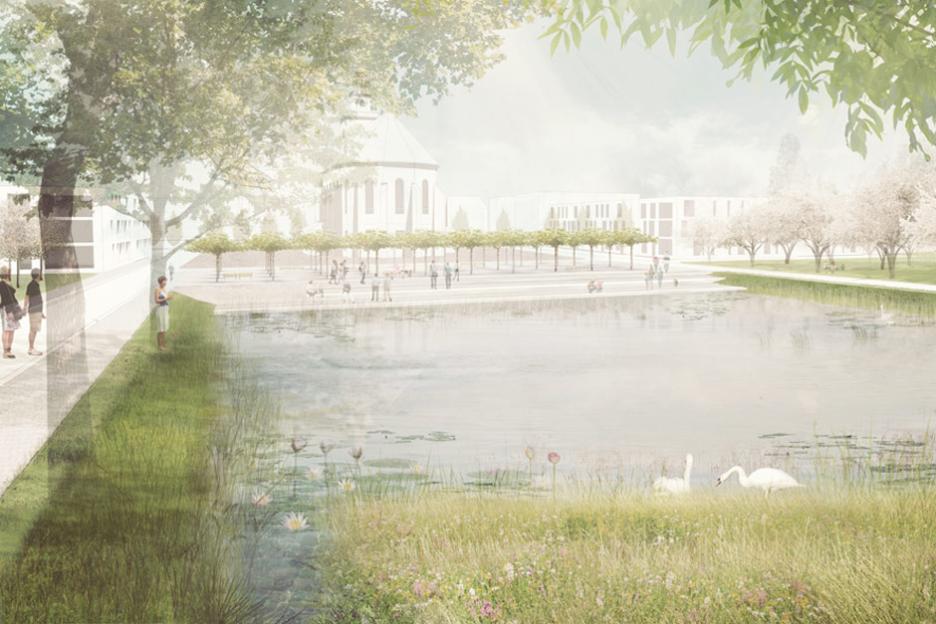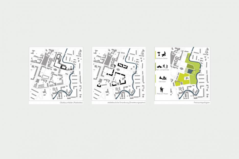 Ein starkes Landschaftsmotiv, eine Wasserfläche als neues Gegenüber von St. Nikolai und dem angrenzenden Marktplatz bildet den Identitätskern, weich gefasst, mit üppigem Seerosenbewuchs -ein Wassergarten. Eingebettet ist dieser in die Ufersäume des Mühlbachs, welche als ein Stück Landschaft in der Stadt eher extensiv zu pflegen sind. Große Obstbaumfelder prägen das neue „Weichbild“ der Stadt, vervollständigen die fragmentarische Bebauung, definieren zudem die Übergangszonen zwischen Bebauung und Landschaftsraum klar und zeichnen somit den Grundriss für einen möglichen Wiederaufbau der Stadtkante in Zukunft vor.