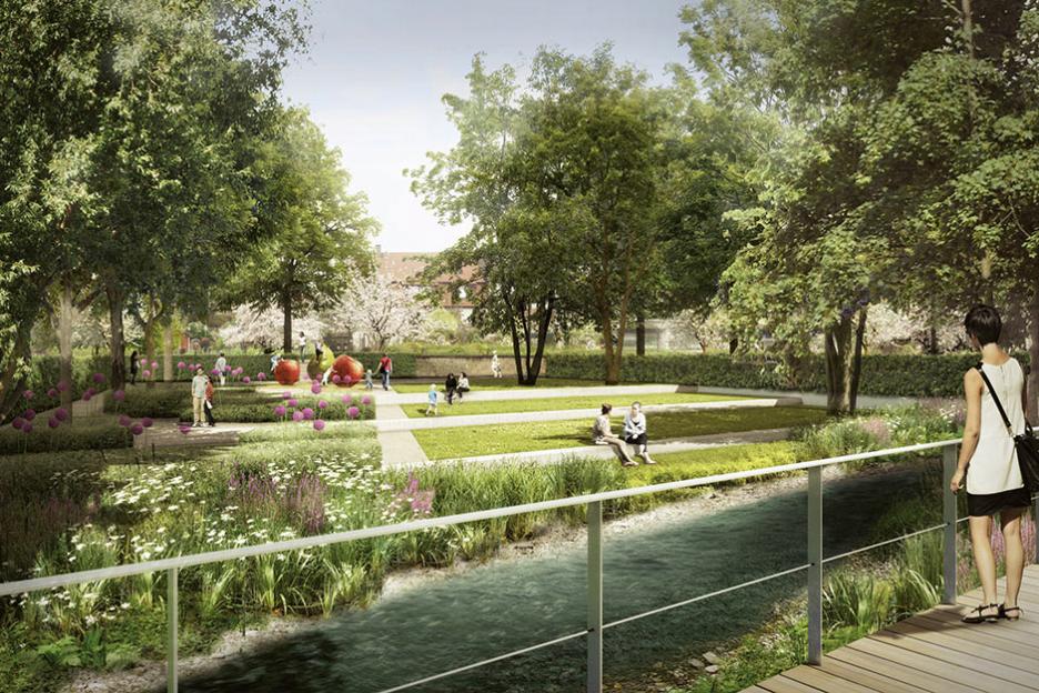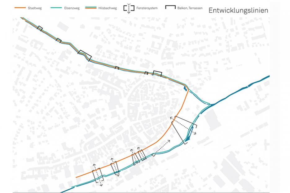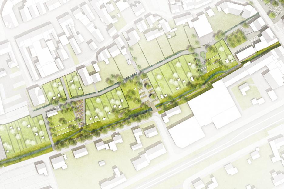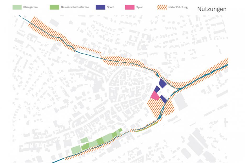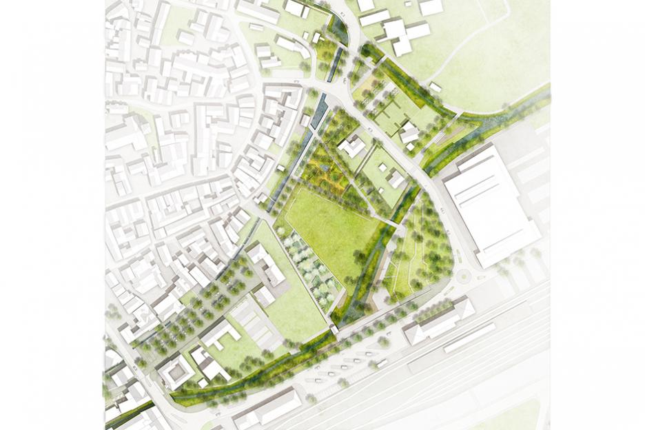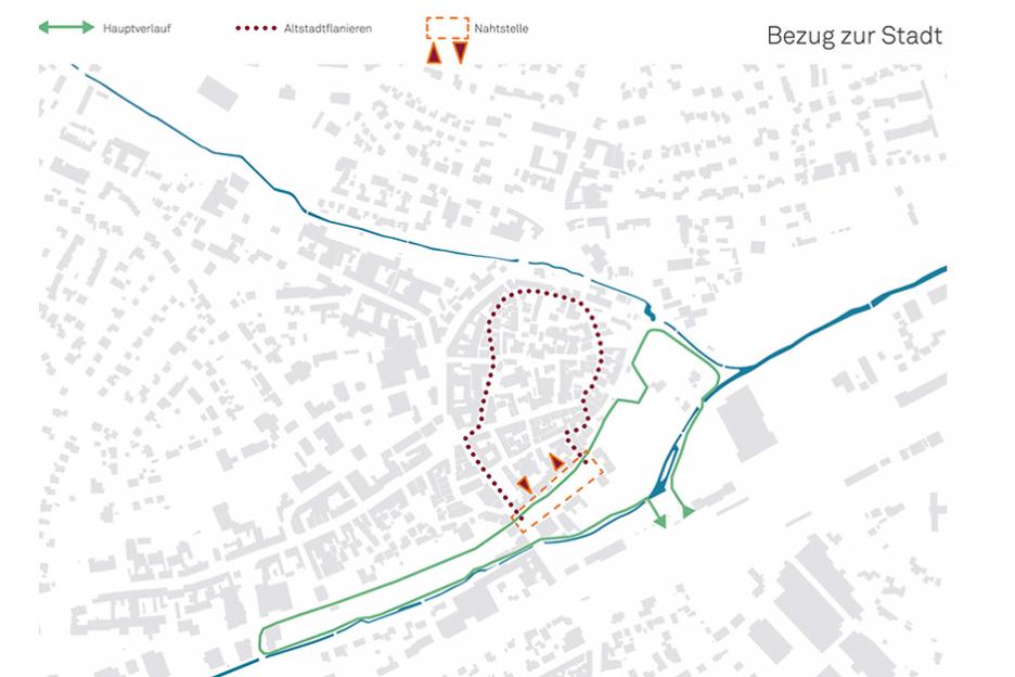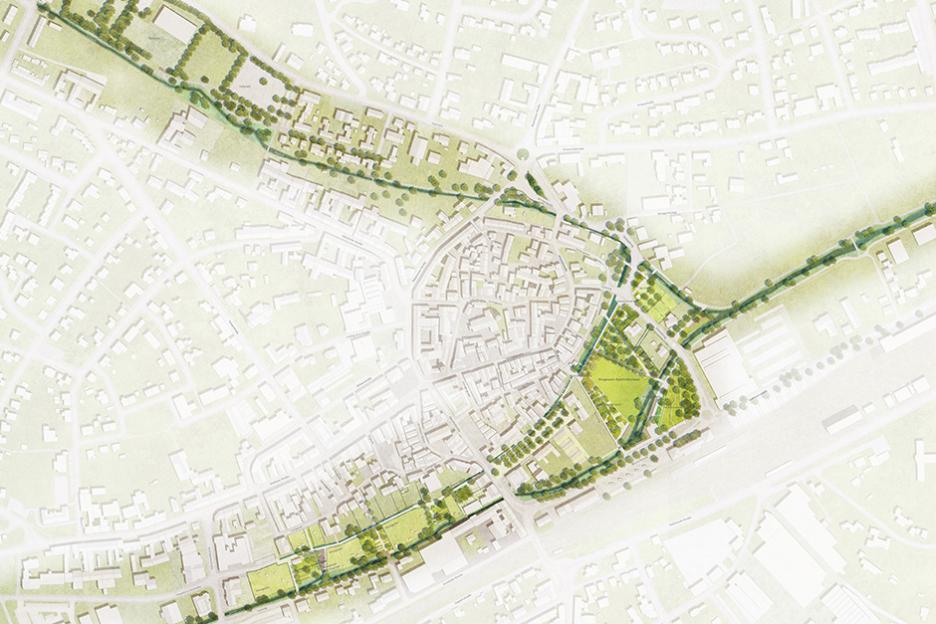 Anknüpfend an einen Rahmenplan von 2015 wird der mangelnde Bezug der Stadt zu seinen zwei Flussläufen erlebbar gemacht.