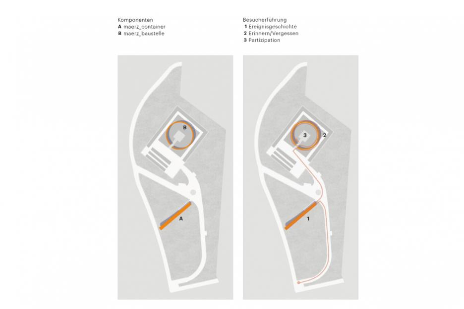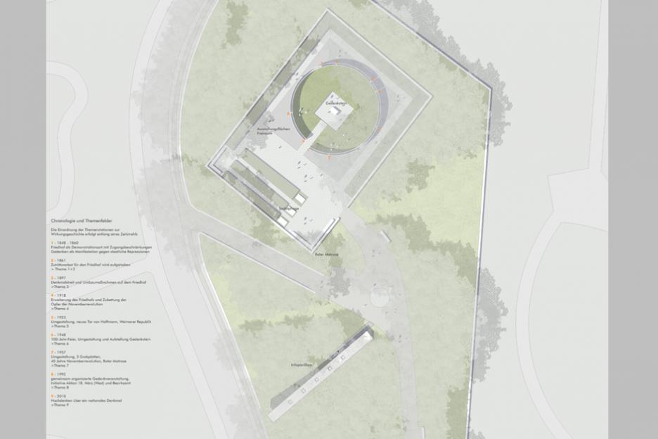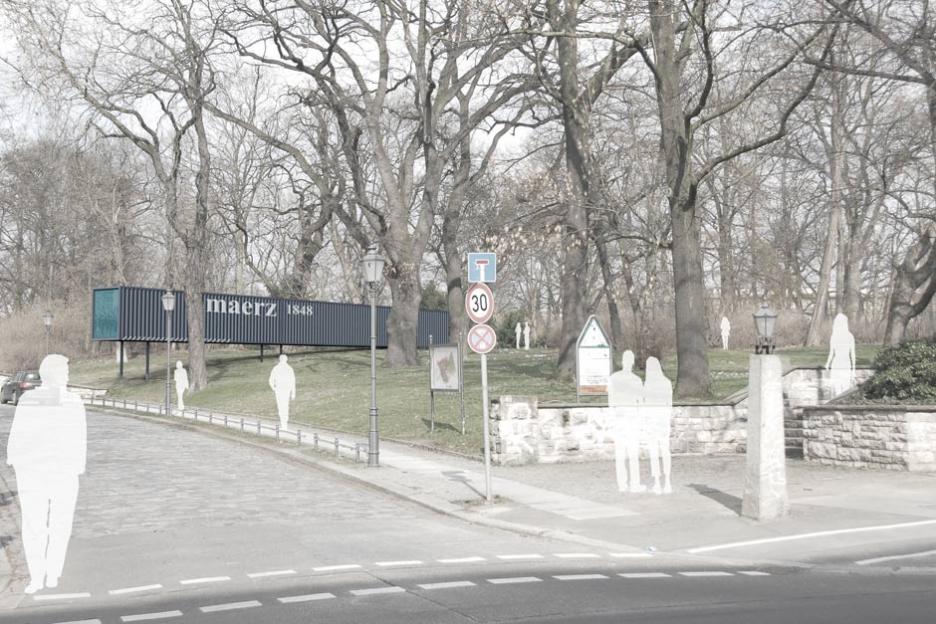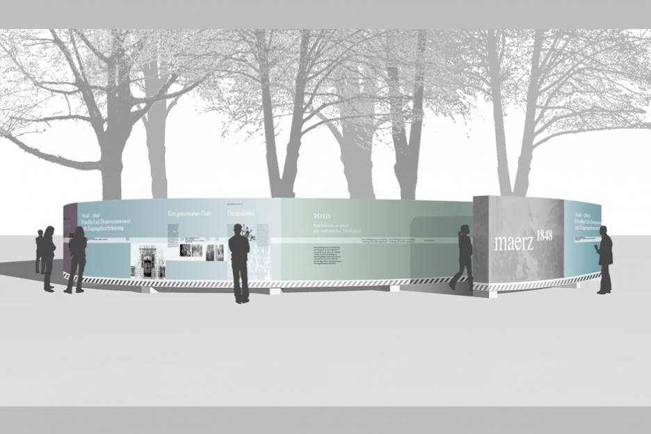 In einem mehrjährigen gesellschaftlichen Diskussionsprozess soll ein Denkmal für die Märzrevolution entwickelt werden. Als gestalterische Metapher für die Begleitausstellung dieses Prozesses wird die „Baustelle“ vorgeschlagen. Es ist die Eigenart der Aufgabenstellung, dass nicht allein die Information über den Ort und die Geschehnisse 1848 im Mittelpunkt stehen. Zentrales Ziel ist die Vermittlung einer „Denkmal-Werdung“ als Prozess und die Aufforderung sich an diesem Prozess zu beteiligen. Folgerichtig wird die Ausstellung als temporäres Ereignis konzipiert, die den endgültigen Zustand vorbereitet. Die Bildsprache der Ausstellungsarchitektur verkörpert diesen Zustand des Übergangs und meidet die Anmutung des Fertigen. Gleichwohl besetzt die Ausstellungsinstallation den Ort kraftvoll und dominant. Die Wissensvermittlung wird in 3 Themenfelder gegliedert, dem jeweiligen Vermittlungsprozess wird dabei ein eigenes Raumbild und Bewegungsmuster zugeschrieben.