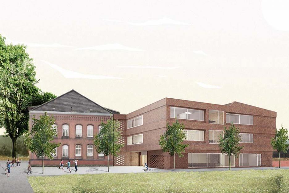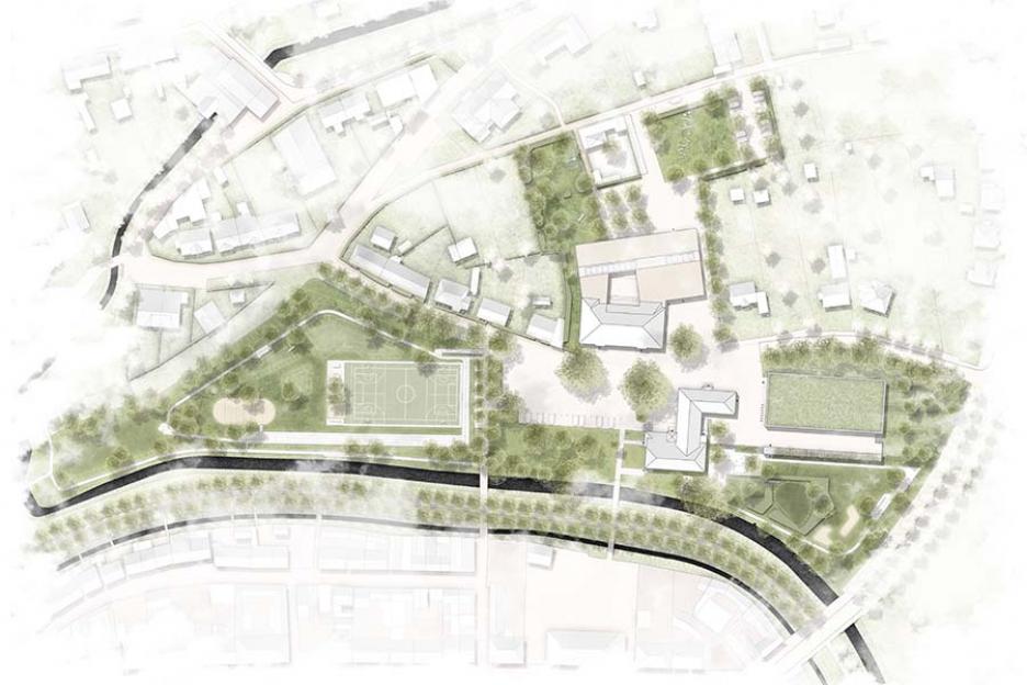 Eingebettet in eine ereignisreiche, parkähnliche Spiel- und Sportlandschaft, werden die Neubauten im Zusammenspiel mit den Bestandsbauten und der Topografie zu einem präzisen Ensemble gefügt.